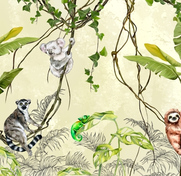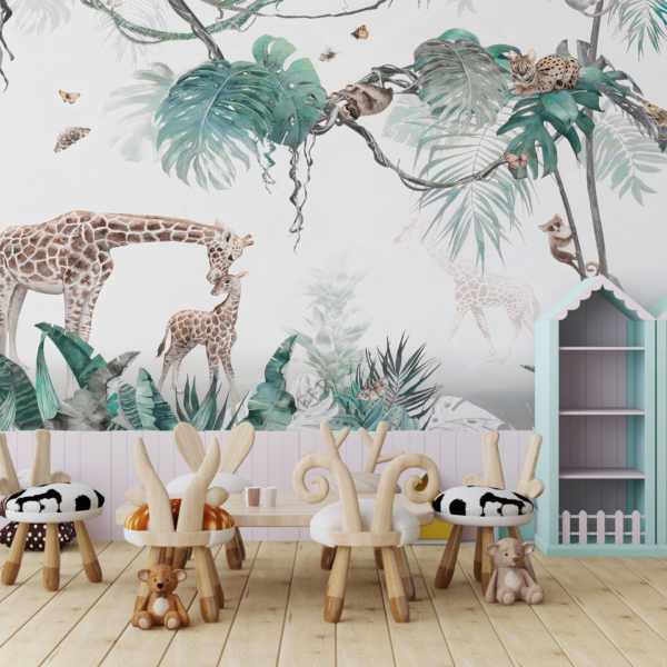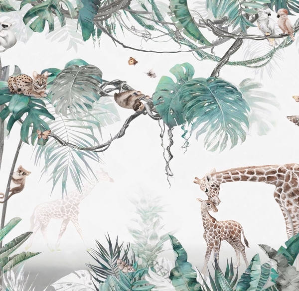 - 3D, Fototapeten, JUNGE, Kinder, MÄDCHEN, TIERE, TROPISCHE BLÄTTER, WOHNZIMMER, Zimmer