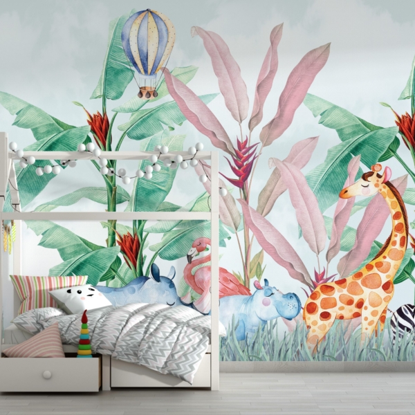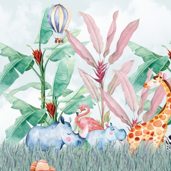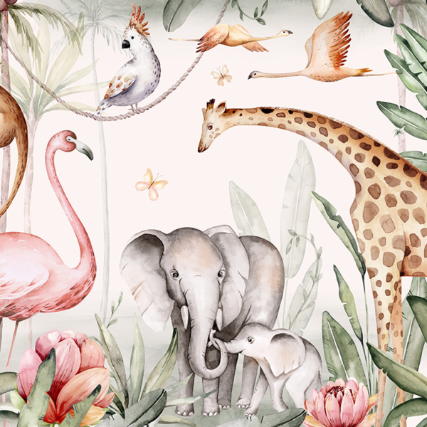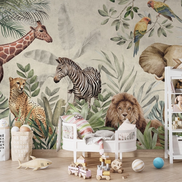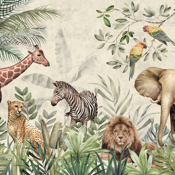 - Produktnummer: 1384031620 Diese Fototapete wurde für ein Kinderzimmer entworfen und zeigt exotische Tiere. Es zeigt u.a. einen Löwen, ein Zebra, eine Giraffe, einen Elefanten und bunte Papageien. Die Tiere sind in einem Dickicht aus exotischen Pflanzen versteckt. Das Ganze ist bunt, aber die verwendeten Farben sind nicht zu intensiv. Dadurch wird das Wandbild nicht übermäßig das Auge des Kindes anziehen.…
