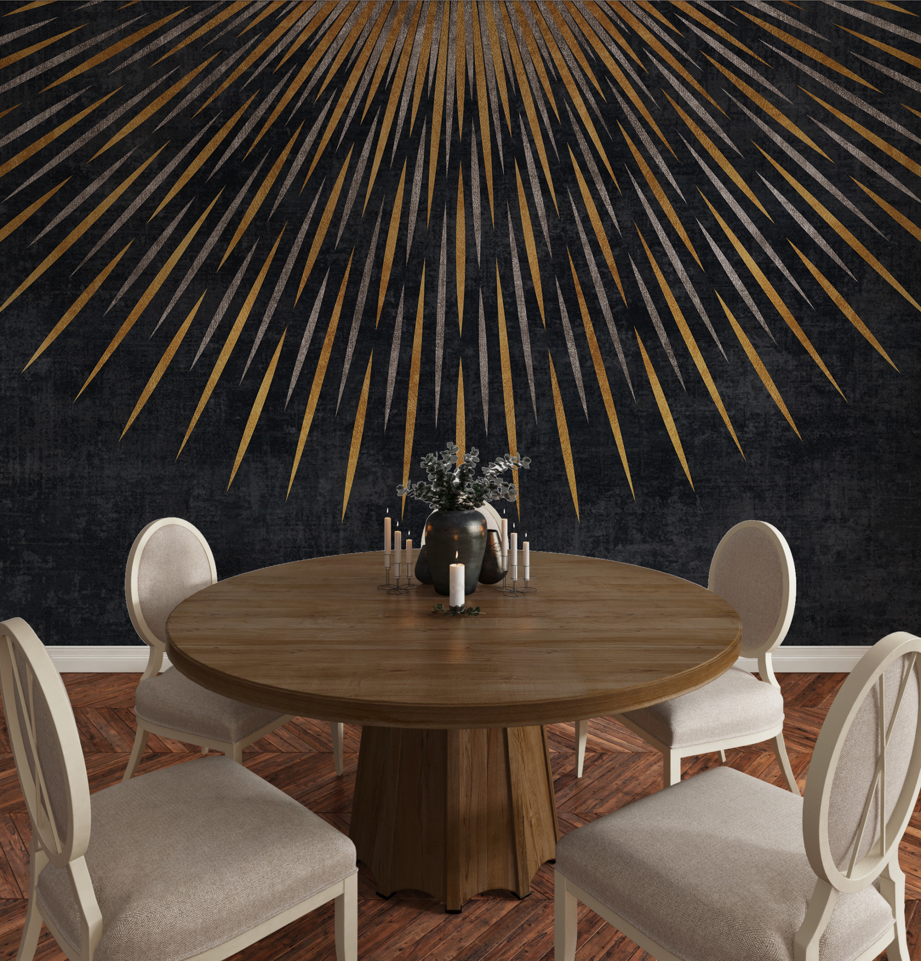 Diese wunderschöne Fototapete ist die perfekte Möglichkeit, die Einrichtung eines jeden Raumes zu erfrischen. Die goldenen Strahlen auf einem graphitfarbenen Hintergrund verleihen dem Interieur Eleganz und Modernität und schaffen gleichzeitig eine gemütliche Atmosphäre.