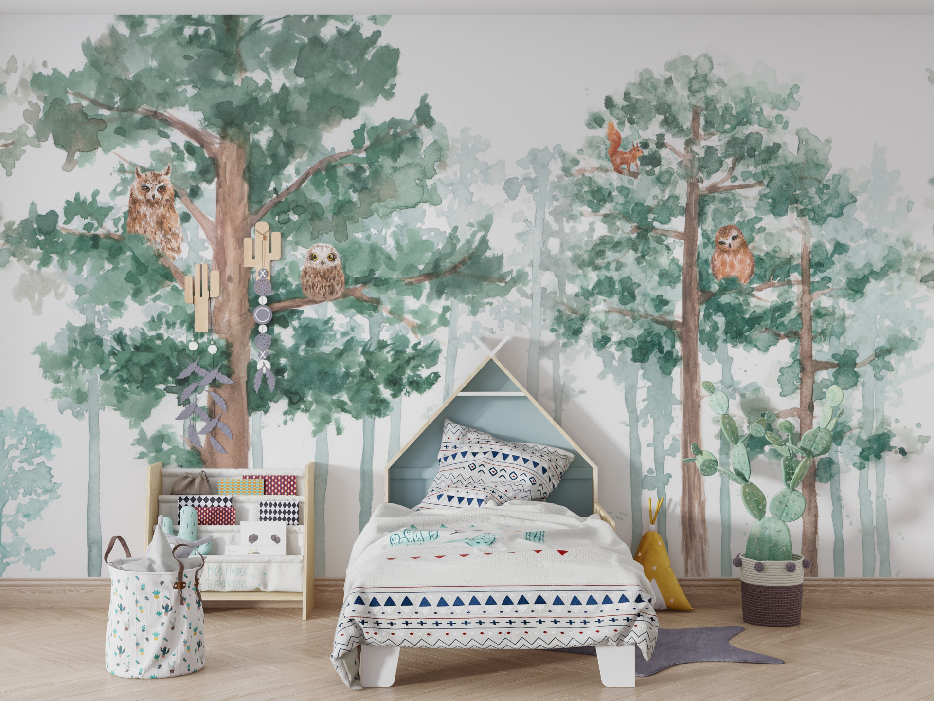 Holen Sie sich die Natur zurück in Ihr Zuhause mit dieser wunderschönen Fototapete, die Sie in die magische Welt der Eulen und Bäume im Wald entführt.