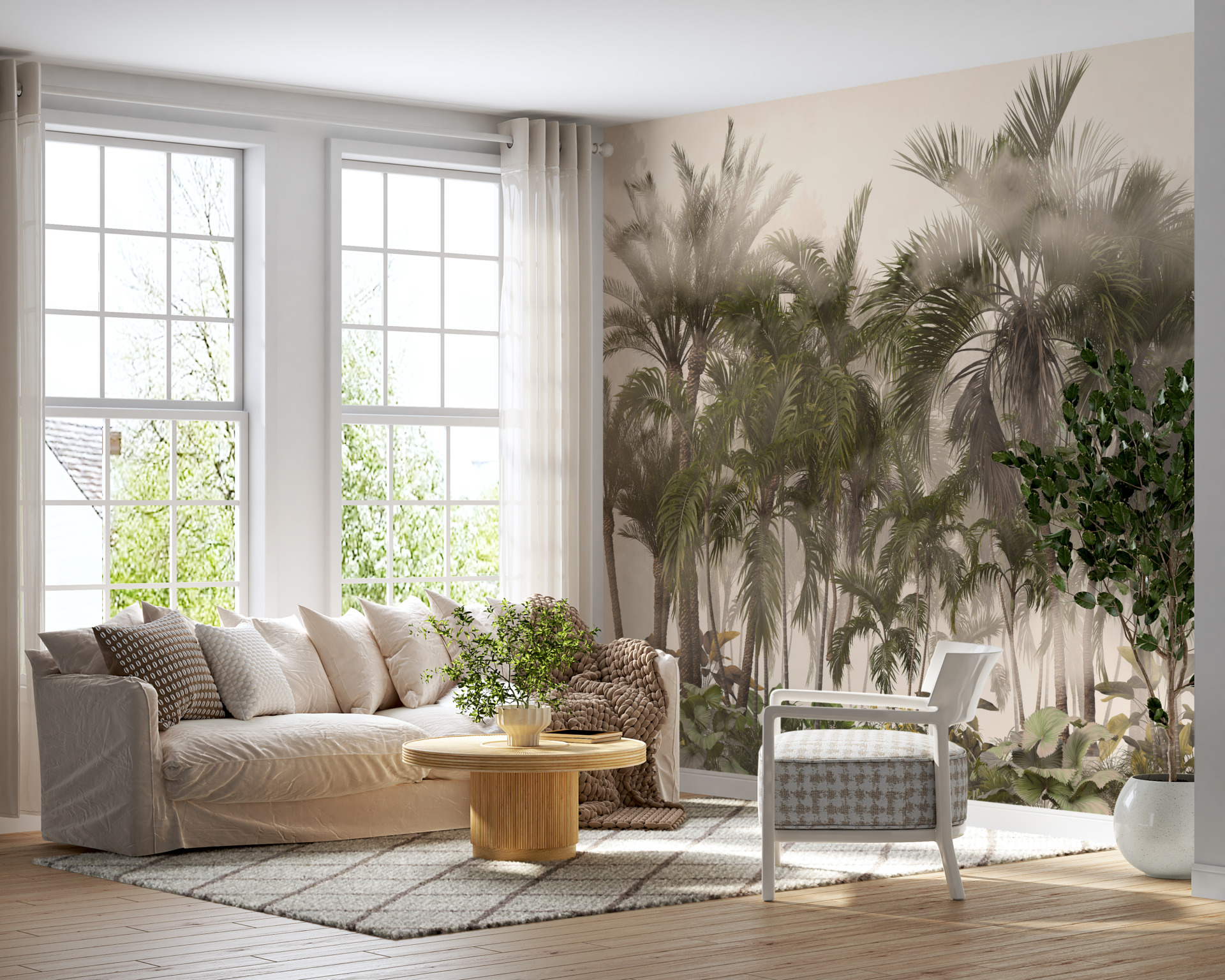 Verleihen Sie Ihrem Interieur mit dieser charmanten Fototapete ein tropisches Flair. Palmen im Dschungel ist ein von der üppigen Vegetation des Regenwaldes inspiriertes Motiv, das jeden Raum erfrischen wird.