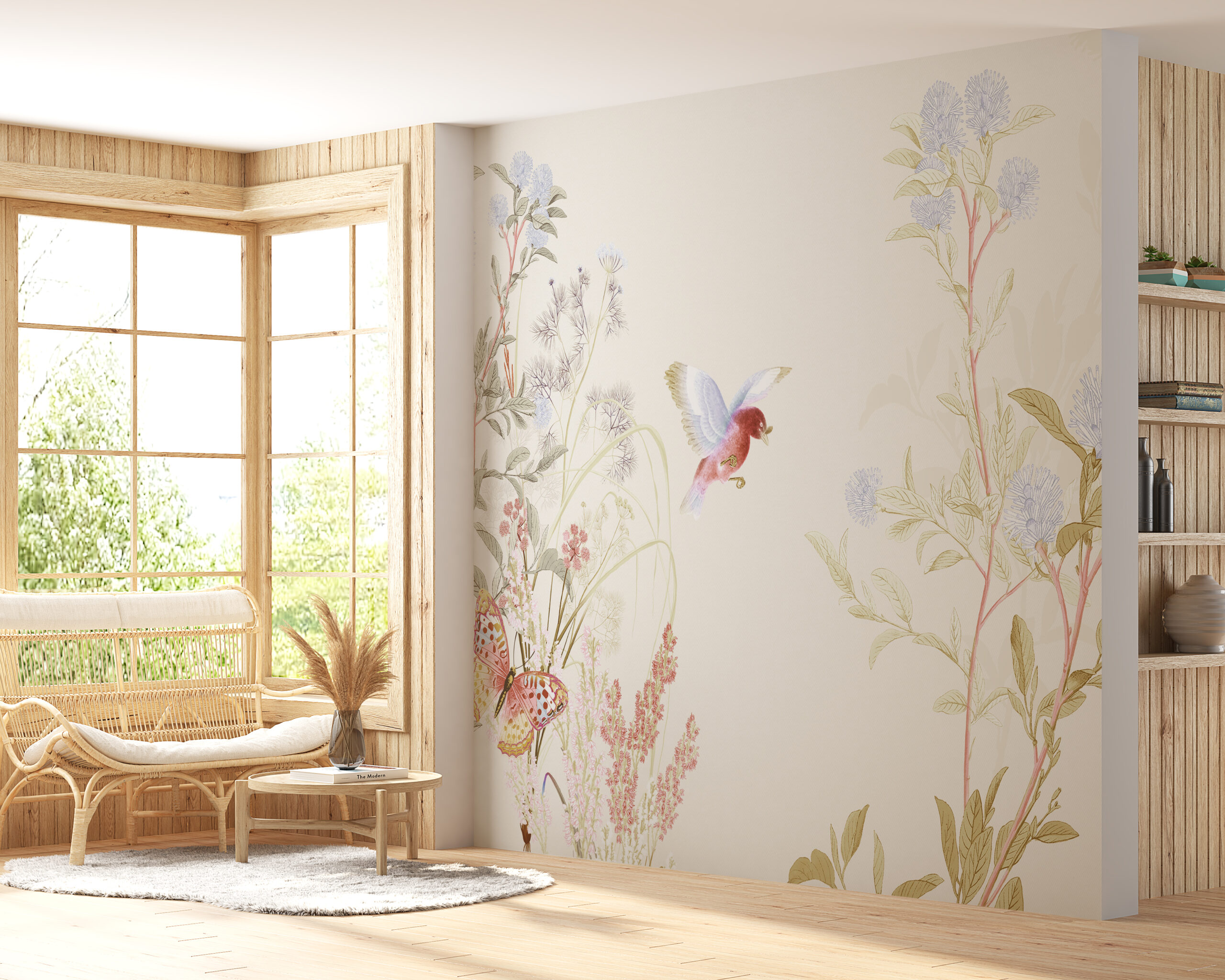 Lassen Sie Ihrer Kreativität freien Lauf und erfrischen Sie Ihr Interieur mit der Fototapete Vogel und Schmetterling zwischen den Blumen! Bestellen Sie jetzt und holen Sie sich die Freude des Frühlings in Ihr Zuhause.