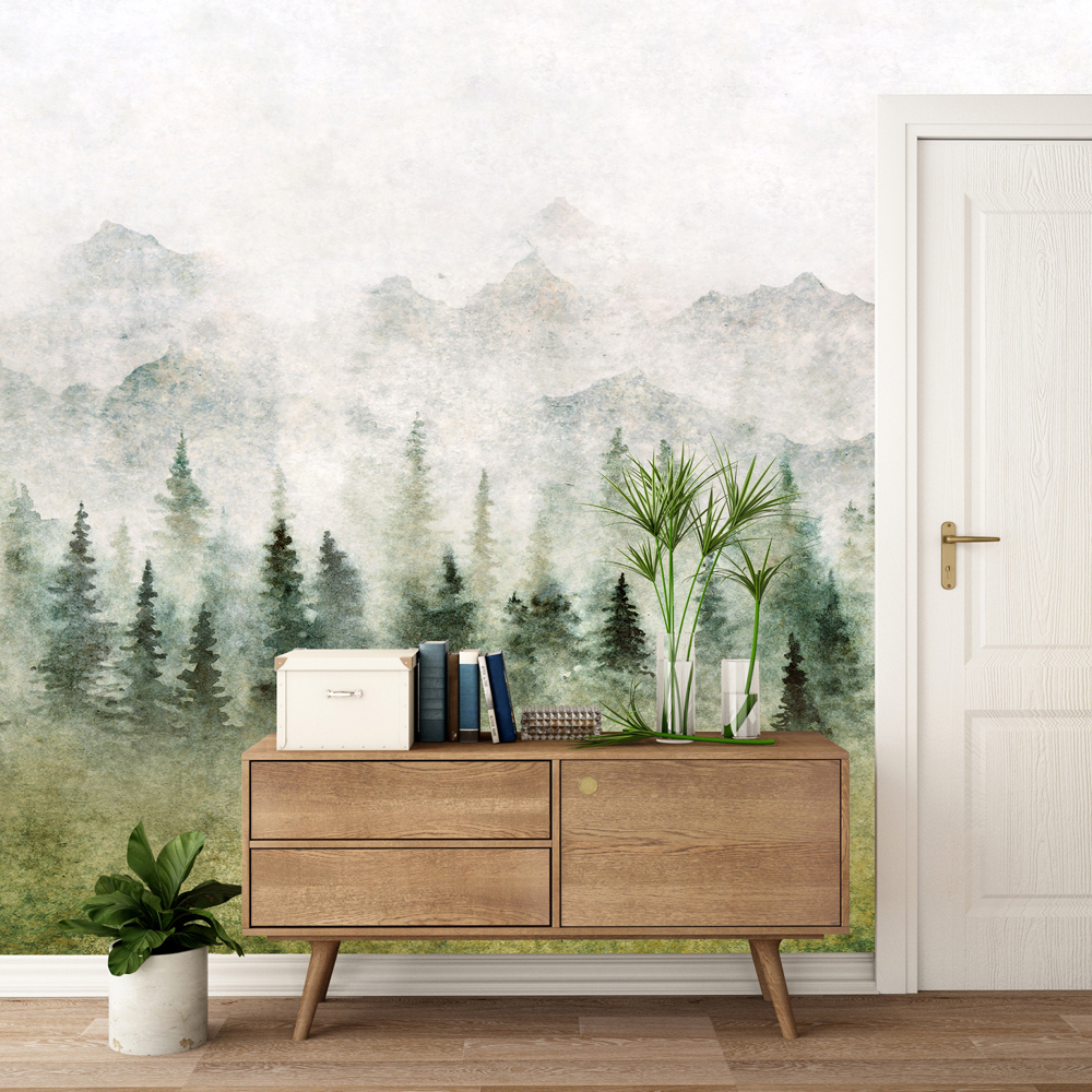 Fototapeten Aquarellgemälde eines Waldes im Nebel