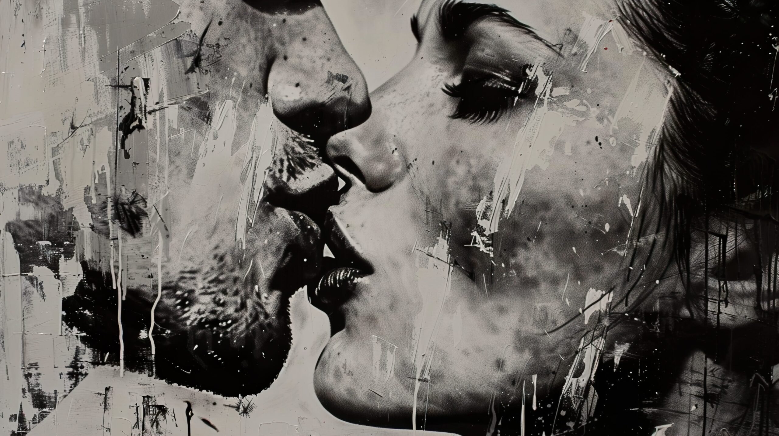 Verleihen Sie Ihrem Interieur mit der Fototapete „Touch of Silence“ eine einzigartige Atmosphäre. Dieses ausdrucksstarke Schwarz-Weiß-Bild, das die Nahaufnahme zweier Menschen im Moment eines innigen Kusses zeigt, vereint Subtilität und tiefe Emotionen und verleiht dem Raum eine einzigartige, von Spannung und Zartheit geprägte Atmosphäre. Künstlerische Pinselstriche und kontrastierende Details schaffen eine harmonische Komposition, die sich perfekt in moderne wie minimalistische Einrichtungen einfügt.