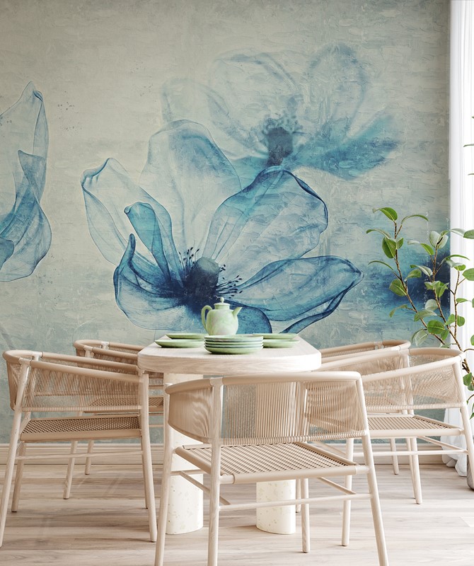 Schlagwörter: Blaue Blumen, Blumentapete, Pflanzenmotiv, Romantische Tapete, Schlafzimmertapete, Wanddekoration, Wohnzimmertapete