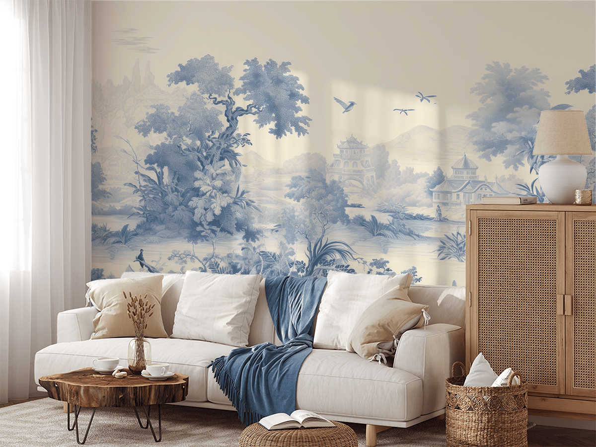 Verleihen Sie Ihrem Zuhause mit der Fototapete „Blaue Oase der Ruhe“ eine einzigartige Atmosphäre. Diese dezente, blaue Landschaft, inspiriert von klassischen asiatischen Gravuren, schafft eine Atmosphäre der Ruhe und Gelassenheit und passt perfekt zu modernen wie traditionellen Interieurs. Detailgetreue Wiedergabe von Pflanzen, Vögeln und Architektur verleiht dem Raum einen anspruchsvollen, künstlerischen Charakter.