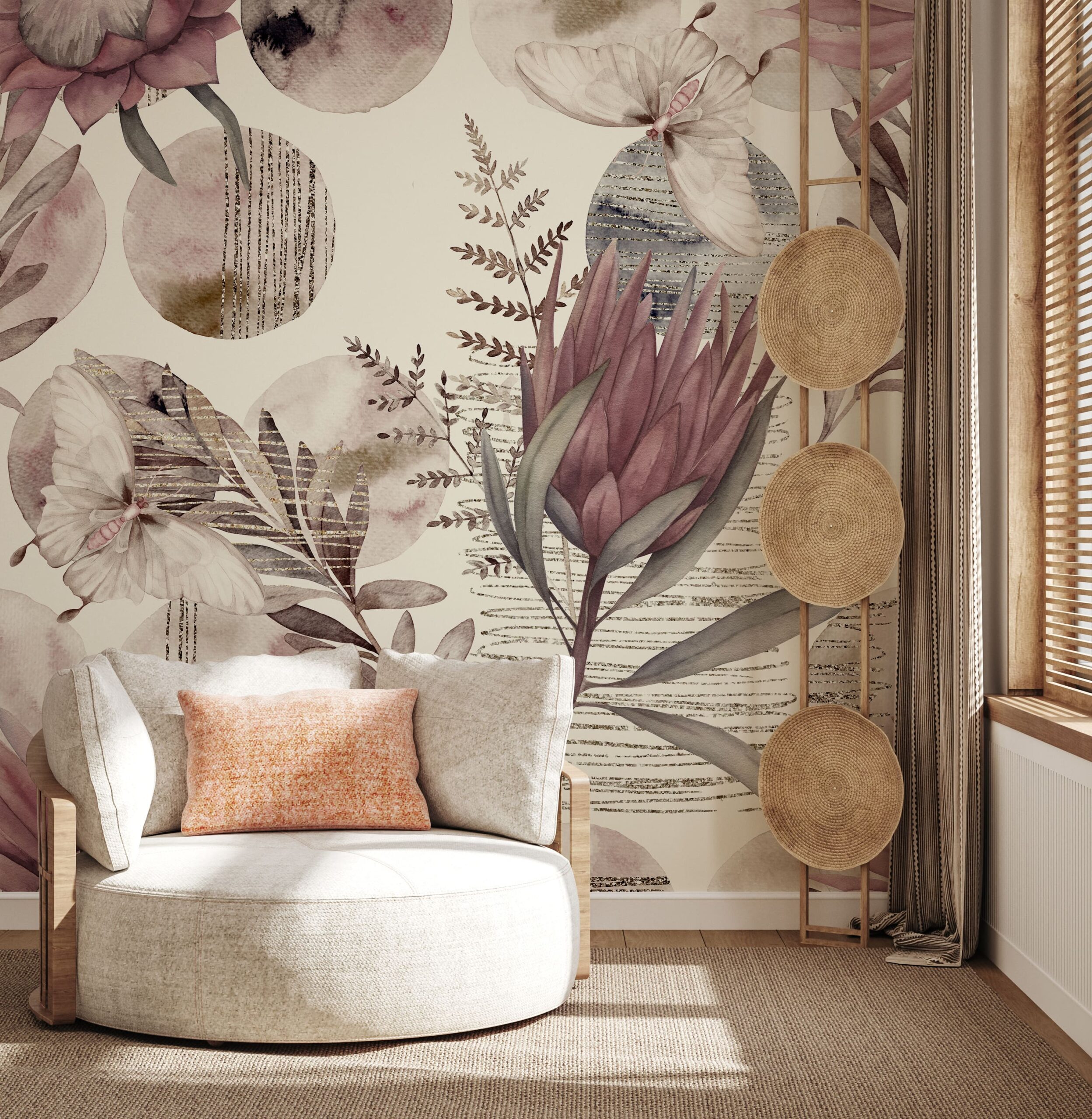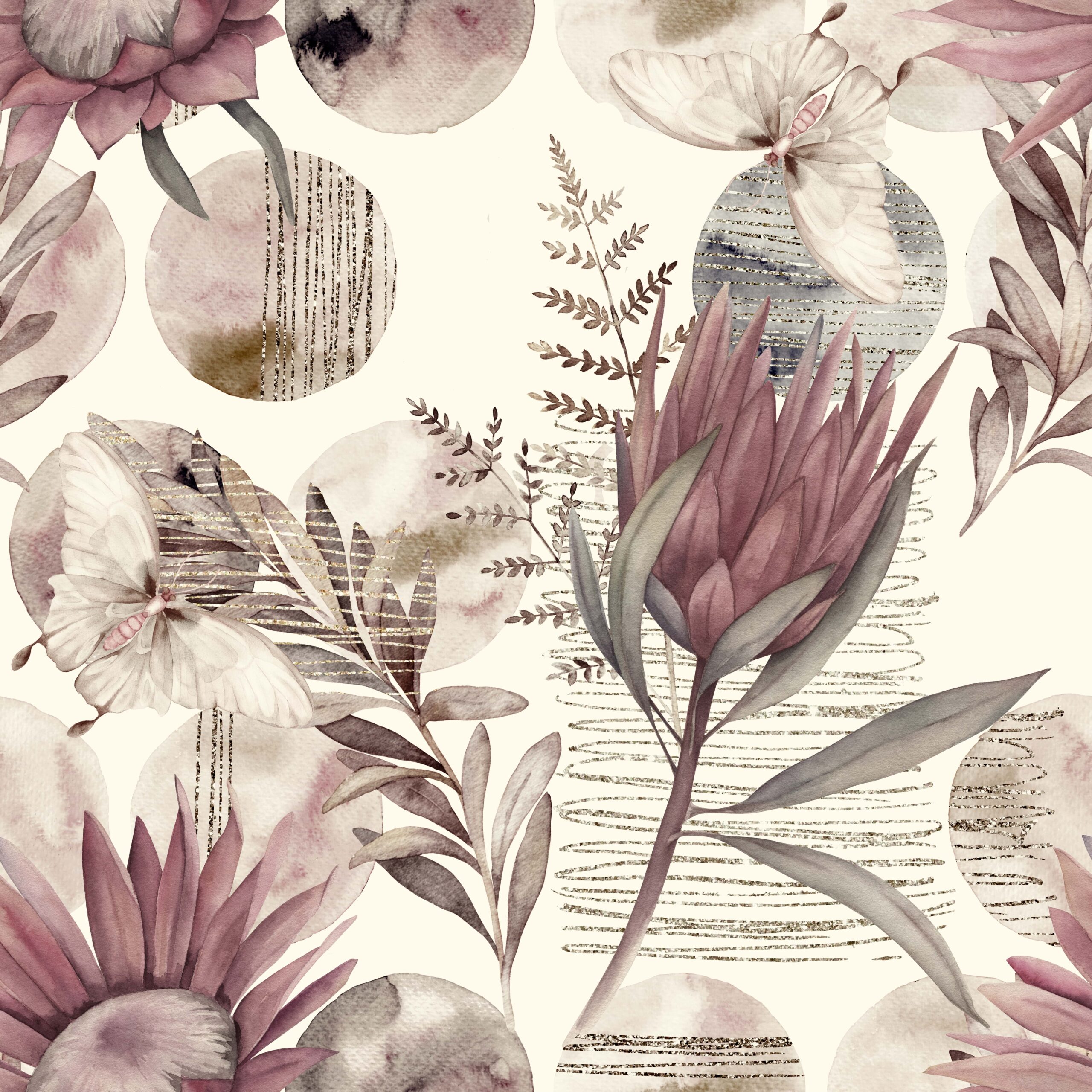 Verleihen Sie Ihrem Interieur mit der Wandtapete „Botanische Melodie“ eine einzigartige Atmosphäre. Dieses zarte, von der Natur inspirierte Aquarellmuster kombiniert Motive von Blumen, Blättern und Schmetterlingen mit sanften, gedeckten Farben in Rosa, Beige und Grau. Goldene Details und grafische Texturen verleihen der Komposition eine elegante und stimmungsvolle Atmosphäre voller Anmut.