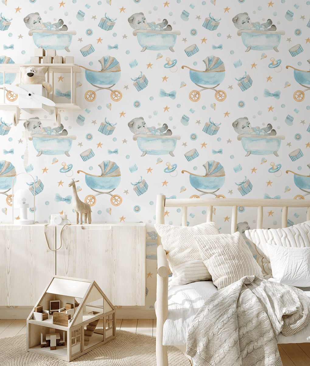 Schaffen Sie mit der Fototapete „Bubble Dreams“ eine zauberhafte und gemütliche Atmosphäre im Kinderzimmer. Das dezente Aquarellmuster mit bezaubernden Kindermotiven wie einem Teddybären in der Badewanne, Spielzeug und kleinen Details in pastellblauen Tönen bringt Ruhe und Wärme in jeden Raum. Zarte Farben und weiche Formen ergänzen perfekt die Gestaltung von Baby- und Kleinkinderzimmern.