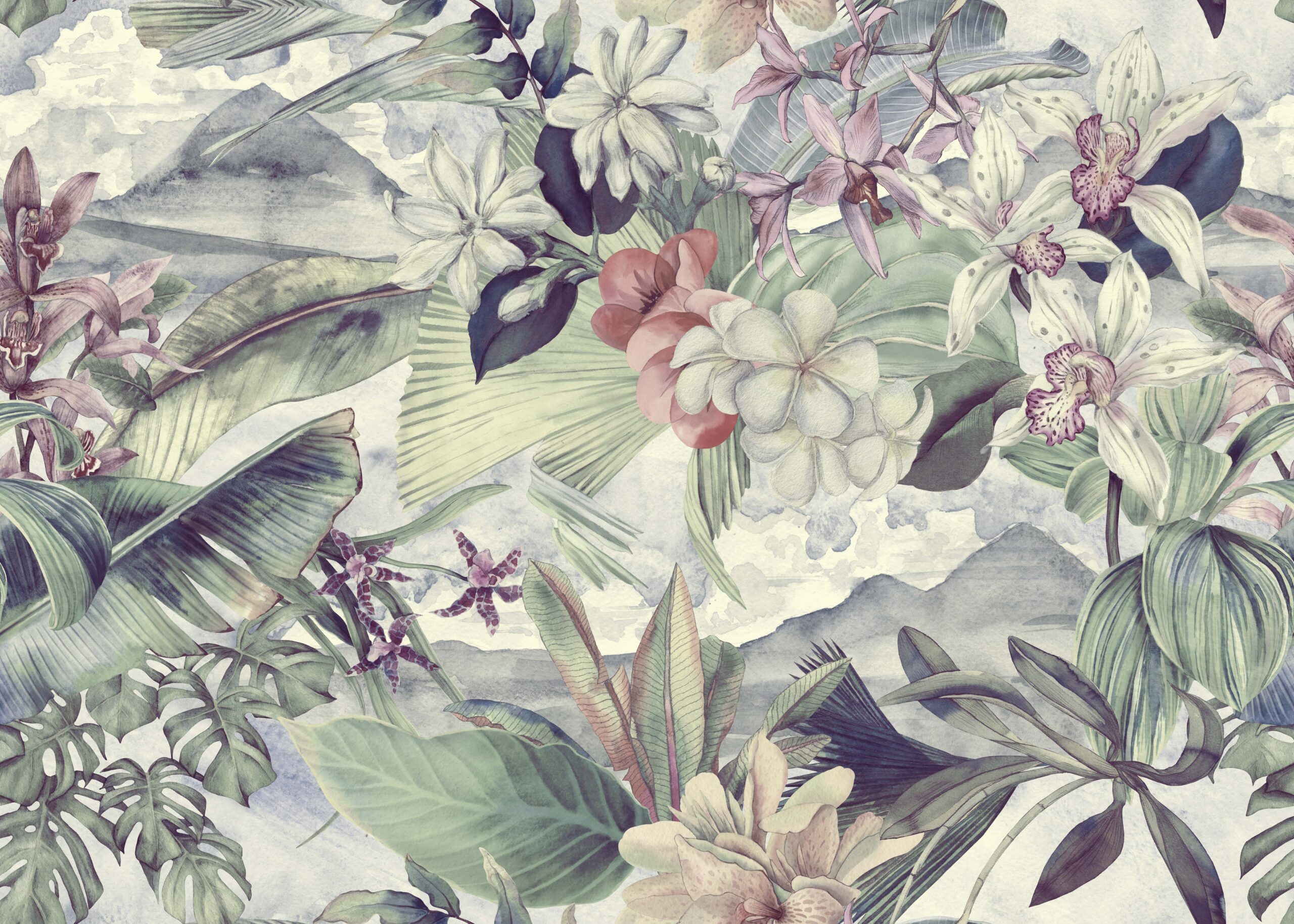 Verleihen Sie Ihrem Zuhause mit der Fototapete „Atem der Tropen“ eine einzigartige Atmosphäre. Das detailreich gestaltete Muster mit tropischen Blättern und Blüten in sanften Pastellfarben erinnert an einen exotischen Dschungel und bringt Frische und Harmonie in Ihre Räume. Feine Details und eine natürliche Farbpalette fügen sich perfekt in moderne und klassische Einrichtungsstile ein.
