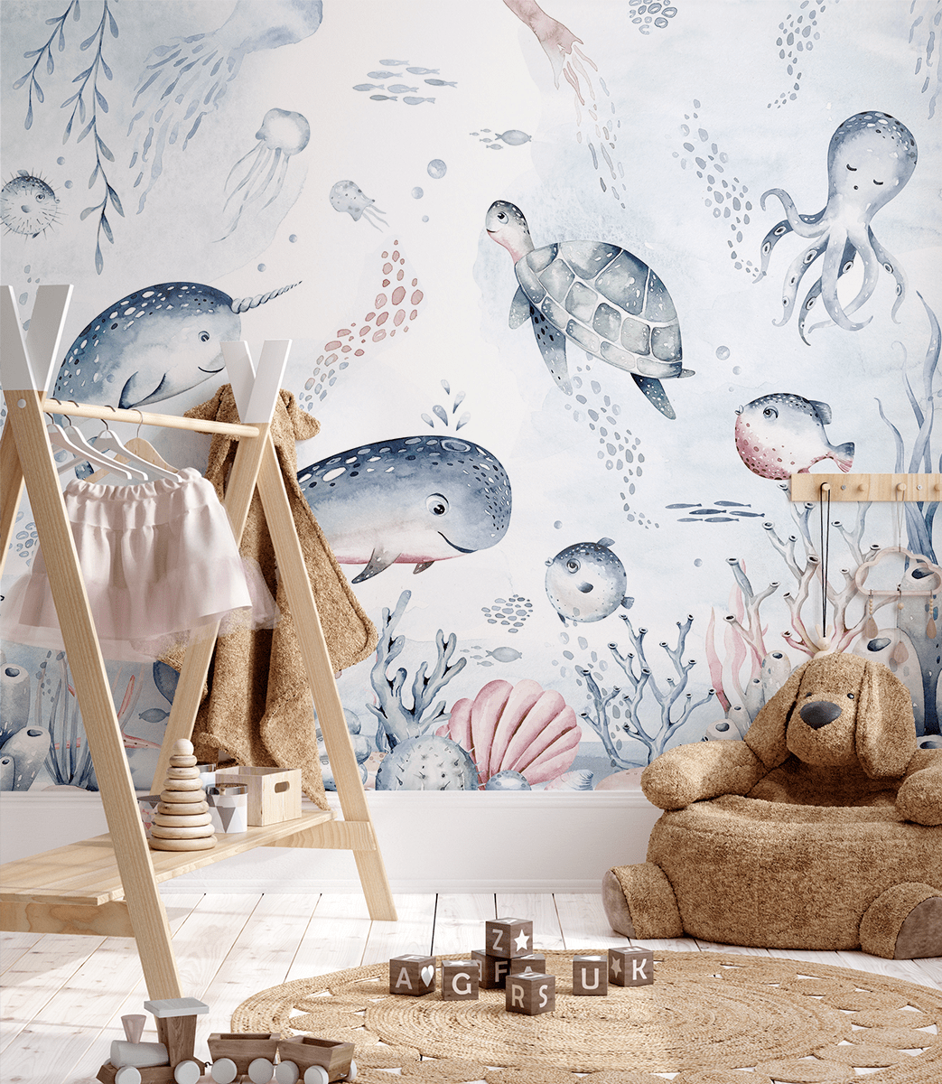 Eine Fototapete ist mehr als nur Dekoration – sie ist eine Unterwasserwelt voller Freunde, die Ihr Kind jeden Tag beim Spielen, Träumen und Entspannen begleitet.