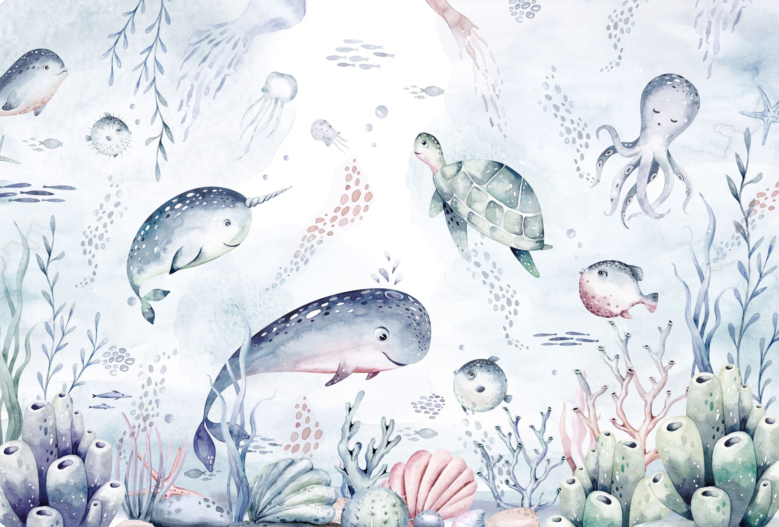 Verwandeln Sie das Zimmer Ihres Kindes mit der Fototapete „Große Meeresfamilie“ in ein verzaubertes Land. Dieses charmante, handgemalte Muster zeigt freundliche Meeresbewohner – vom lachenden Narwal über einen neugierigen Oktopus bis hin zu fröhlichen Fischen und einer ruhigen Schildkröte. Das Ganze ist in zarten Pastellfarben gehalten, die Harmonie, Ruhe und kindliche Freude in den Raum bringen.