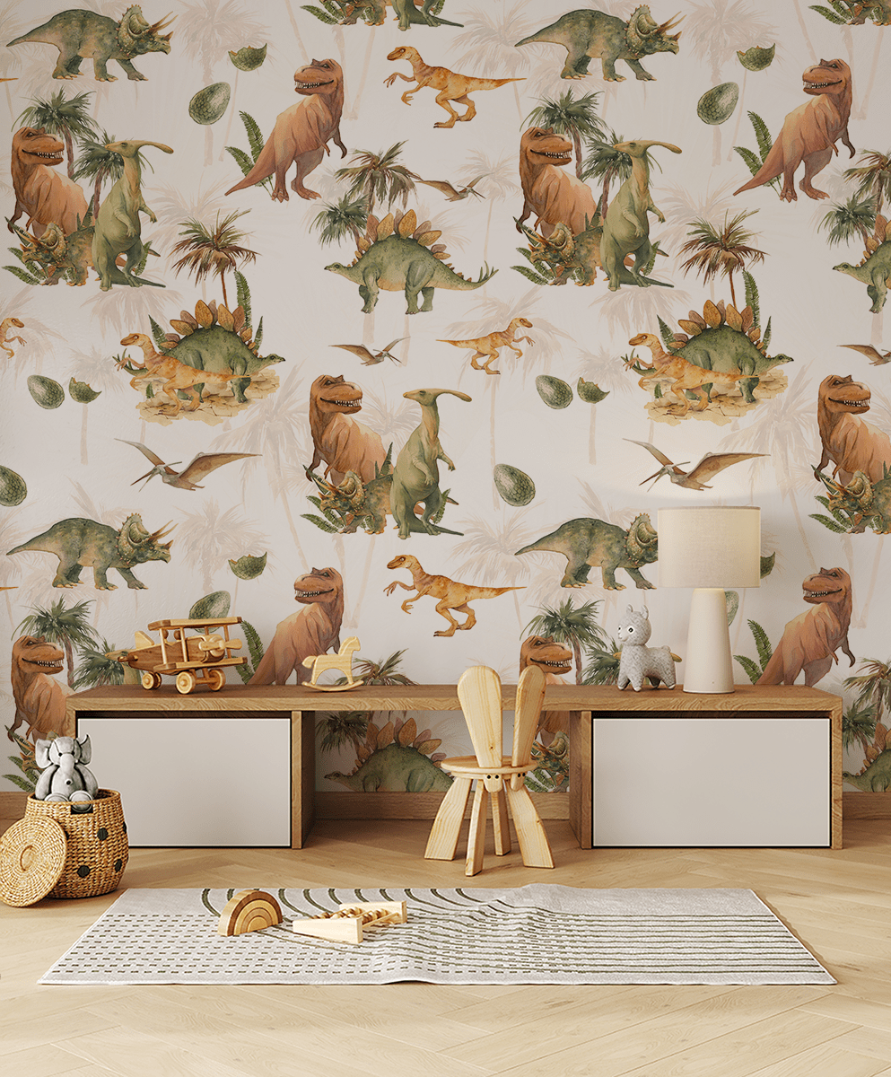 Verwandeln Sie das Zimmer Ihres Kindes mit der Fototapete „Dschungel-Dinosaurier“ in ein faszinierendes Abenteuerland. Dieses farbenfrohe, lebendige Muster entführt Ihr Kind mitten in einen uralten Dschungel, Heimat freundlicher Dinosaurier, exotischer Pflanzen und geheimnisvoller Dinosauriereier. Jedes Detail wurde mit Blick auf die Fantasie von Kindern gestaltet – von lächelnden Tyrannosauriern über majestätische Stegosaurier bis hin zu fliegenden Pterosauriern.
