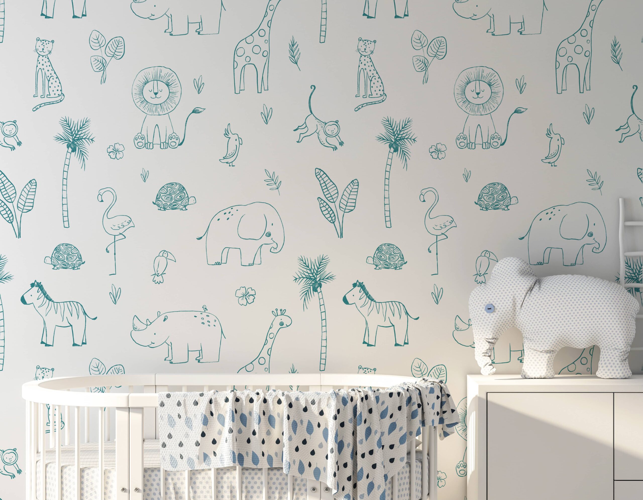Verleihen Sie Ihrem Zuhause mit der Fototapete „Dschungel im Seil“ eine magische Atmosphäre. Das charmante Cartoon-Muster mit Tieren und Pflanzen erinnert an die aufregende Atmosphäre einer Safari und schafft einen Raum voller Wärme, Freude und Spaß. Zarte Illustrationen von Löwe, Elefant, Giraffe und anderen tropischen Tieren lassen jedes Kind sich wie auf einer afrikanischen Safari fühlen.