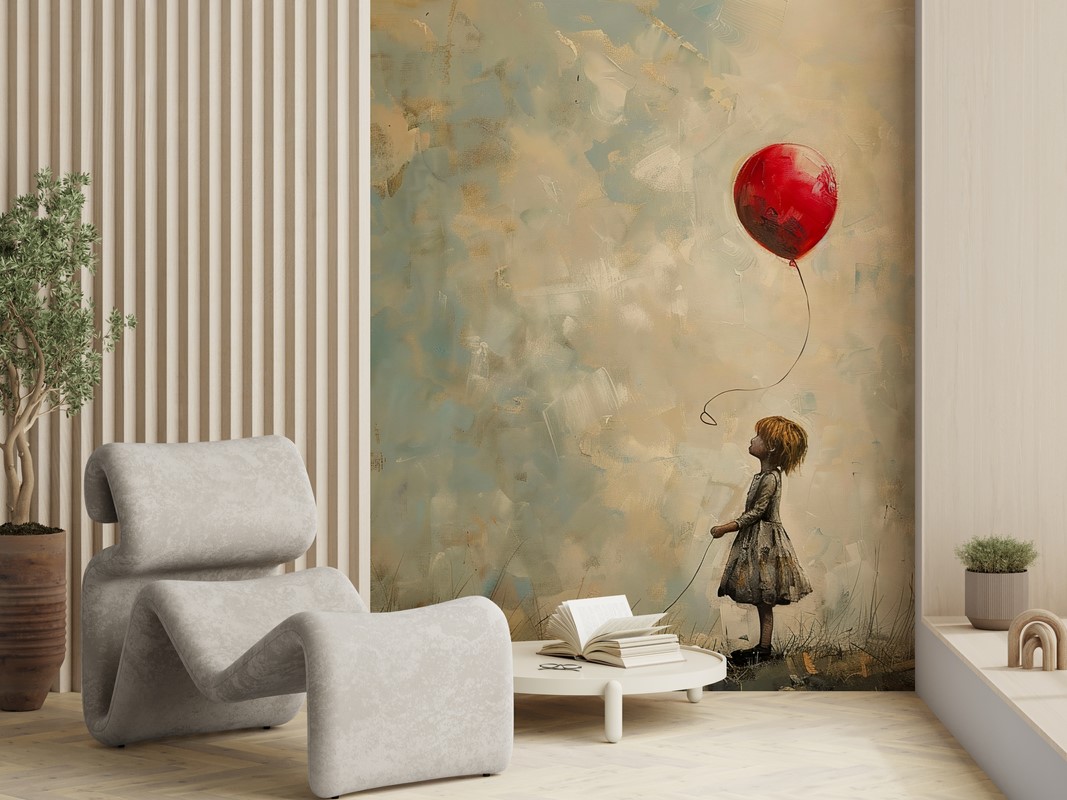 Verleihen Sie Ihrem Zuhause mit der Fototapete „Ein Augenblick flüchtiger Hoffnung“ eine einzigartige Atmosphäre. Diese kunstvolle Komposition zeigt ein Mädchen mit einem roten Ballon, der die Vergänglichkeit von Träumen und einen zarten Funken Hoffnung symbolisiert und dem Raum Wärme und Besinnlichkeit verleiht. Meisterhafte Pinselstriche und harmonische, zurückhaltende Farben schaffen eine Atmosphäre der Ruhe und Kontemplation.