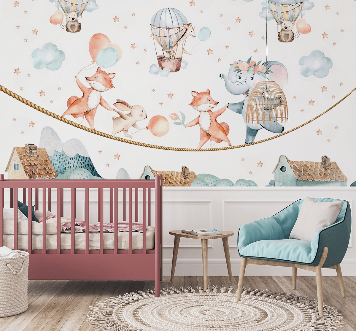 Verleihen Sie dem Kinderzimmer Ihres Kindes mit der Fototapete „Auf Wolken spazieren gehen“ eine einzigartige Welt voller bunter Ballons, niedlicher Tiere und sanfter Wolken. Dieses zarte Pastellmuster entführt Sie ins Land der Fantasie, wo jeder Tag voller Spaß und Freundschaft ist. Leuchtende Farben und sanfte Formen schaffen eine Atmosphäre der Ruhe und Unbeschwertheit – perfekt für die Kleinen.
