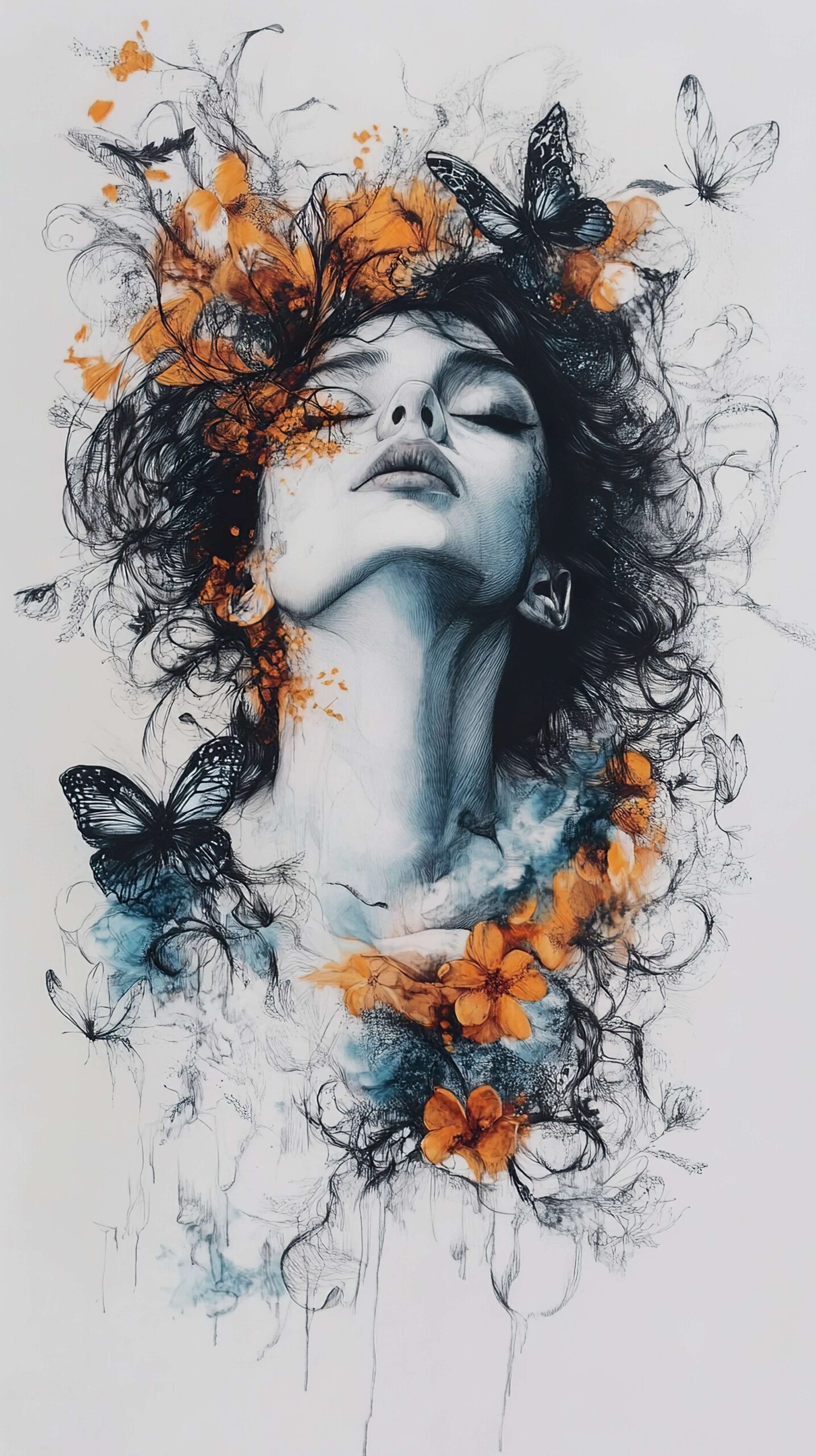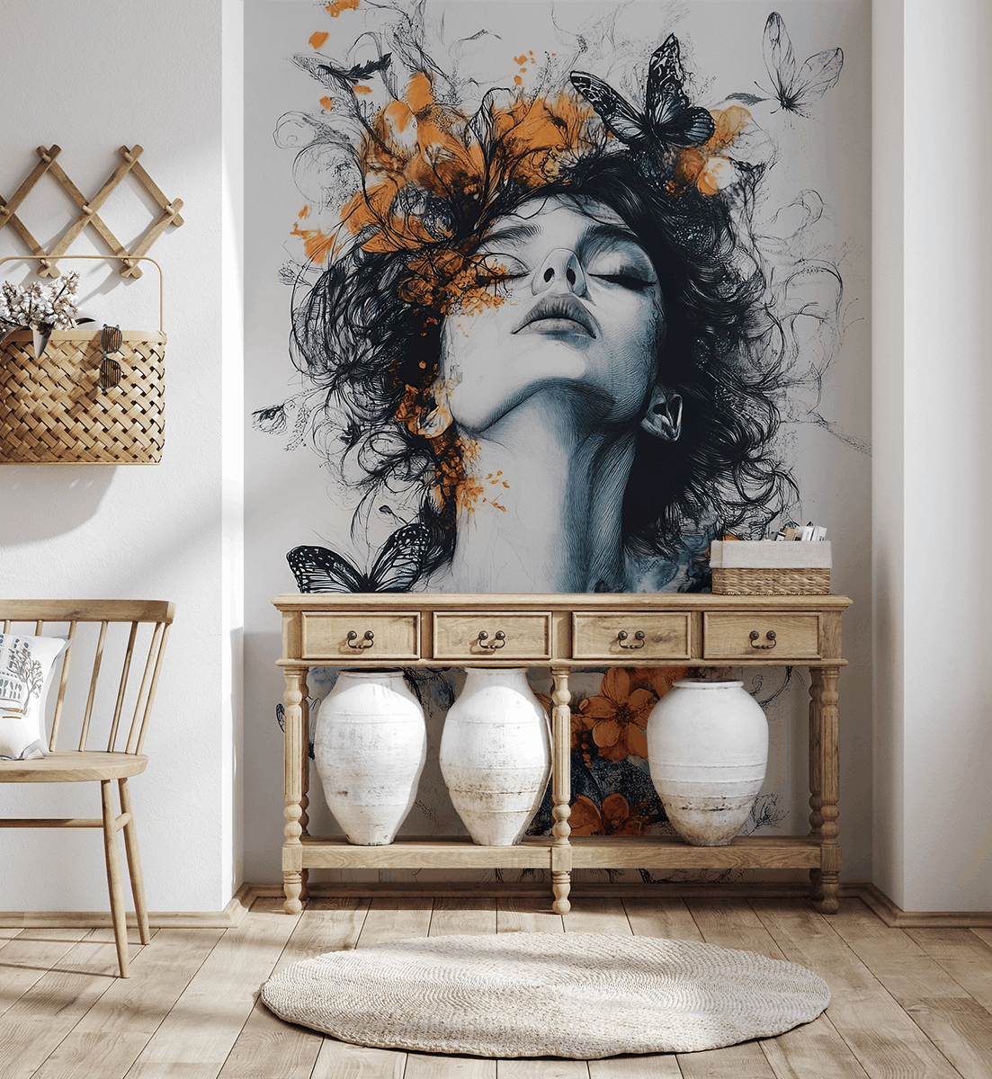Verleihen Sie Ihrem Interieur mit dieser Wandtapete eine einzigartige Atmosphäre. Das bewegende, künstlerische Porträt einer Frau, umgeben von Schmetterlingen und Blumen, kombiniert eine dynamische Skizze mit Farbtupfern und schafft so eine Komposition voller Emotionen, Bewegung und Leichtigkeit. Die Kombination kontrastierender Farben – Schwarz, Orange und Blau – verleiht dem Raum Ausdruckskraft und Tiefe.