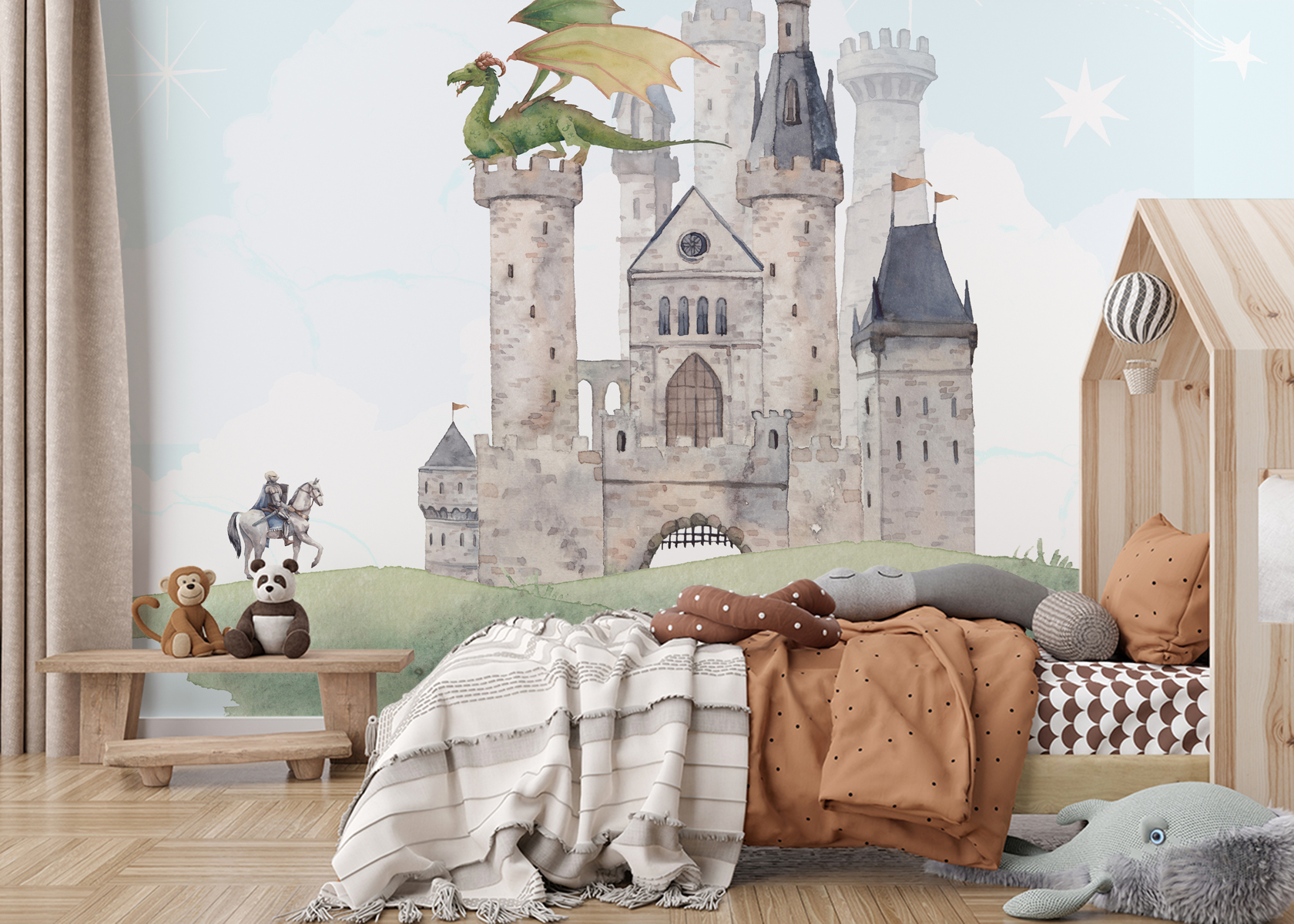 Leuchtende Farben, Pastelltöne in Blau und Grün sowie feine, handgemalte Details sorgen dafür, dass das Wandbild „Aquarell-Burg mit Drachen“ den Raum nicht erdrückt und gleichzeitig Fantasie und Kreativität anregt. Das Märchenschloss-Motiv regt zum Spielen, Geschichtenerzählen und Fantasieren an.