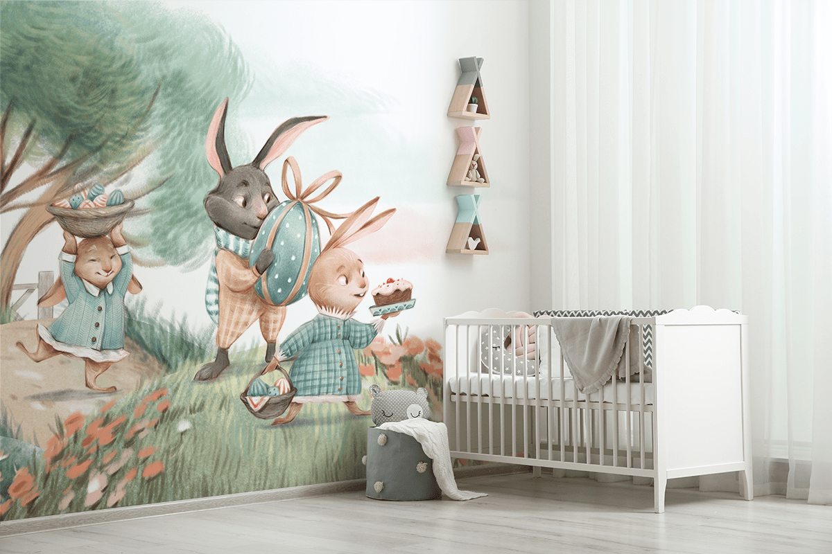 Fototapete „Fröhliche Häschen“ – ein farbenfrohes Abenteuer, fröhliche Stimmung und eine bezaubernde Dekoration fürs Kinderzimmer