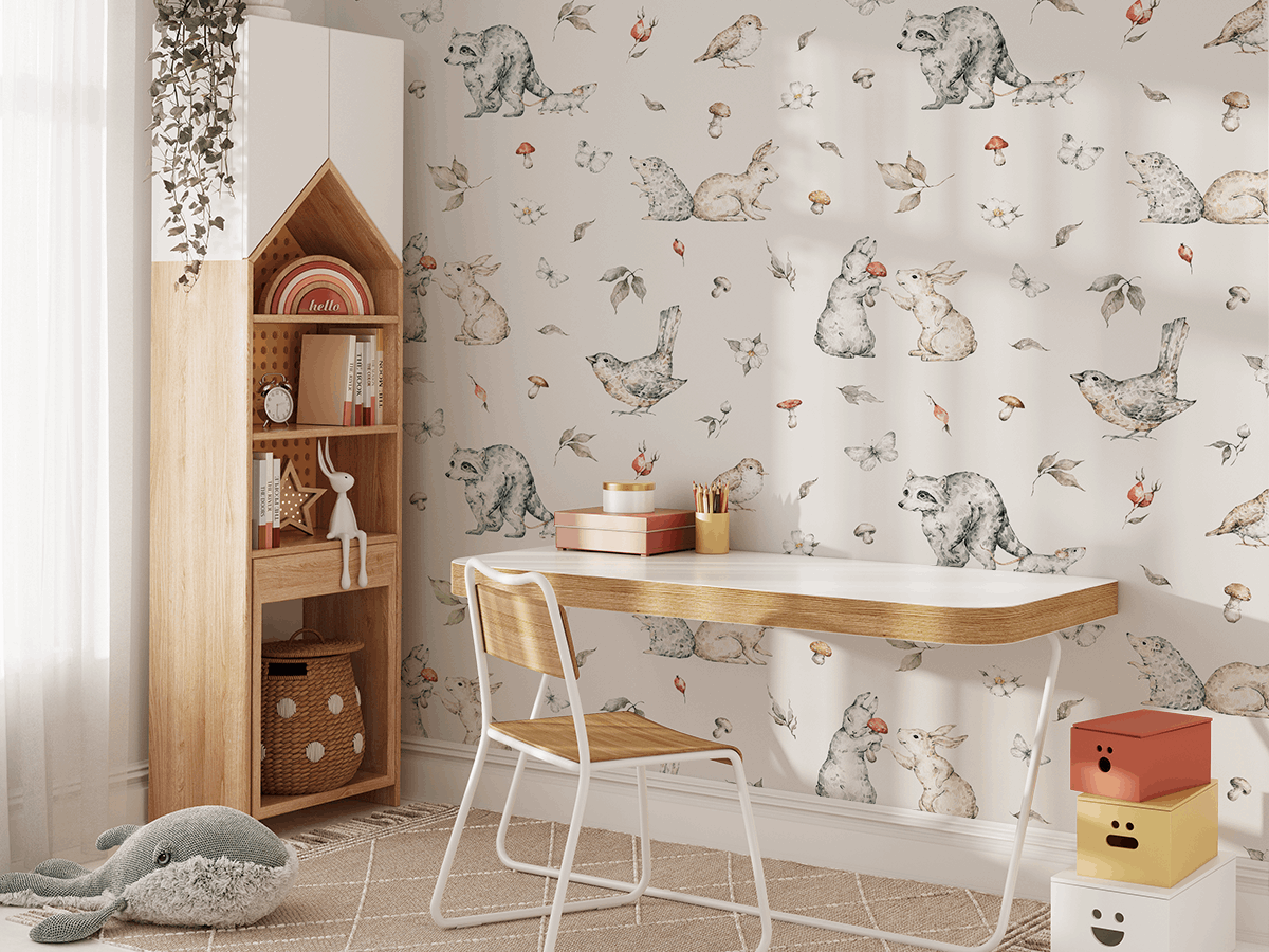 Wir laden die Kleinsten ein, die Natur mit der Fototapete „Geheimnisse der Lichtung“ zu entdecken. Dieses bezaubernde Muster ist voller Waldtiere, Blumen und zarter Blätter und bringt eine warme, freundliche Atmosphäre voller Spaß und Neugier ins Kinderzimmer. Pastellfarben und sanfte Linien machen den Raum gemütlich und inspirierend.