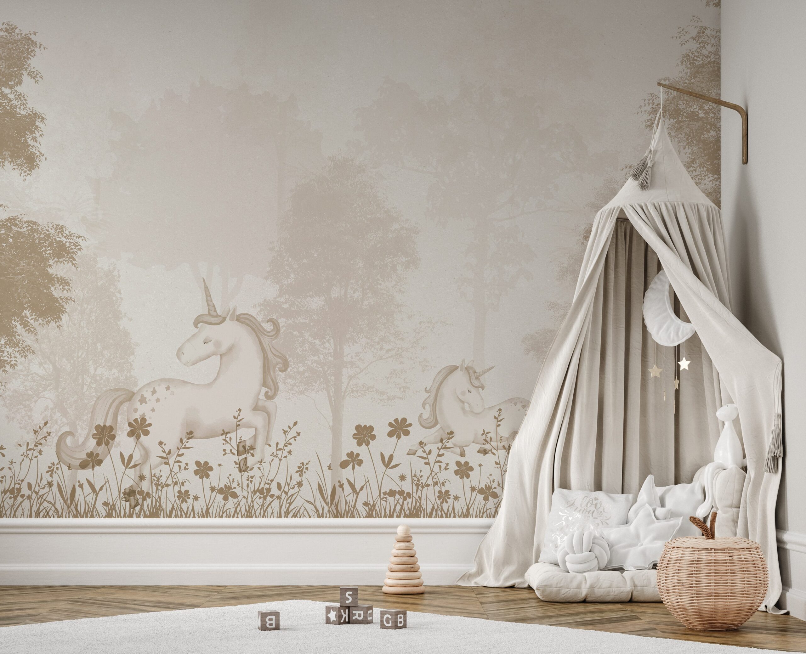 Verleihen Sie dem Kinderzimmer Ihres Kindes mit der Wandtapete „Geheimnisvoller Einhornwald“ eine magische Atmosphäre. Das zarte, in gedeckten Farben gehaltene Muster zeigt bezaubernde Einhörner, die durch einen Zauberwald zwischen Blumen, Bäumen und Waldpflanzen wandern. Die dezente Illustration schafft eine ruhige, verträumte Atmosphäre – perfekt zum Entspannen und Träumen.