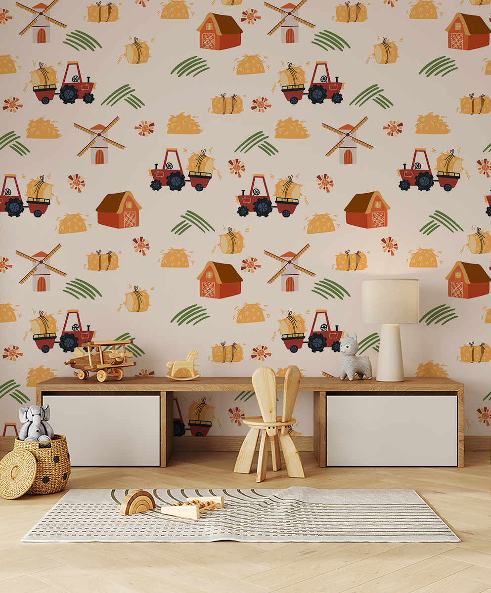 Tauchen Sie ein in die friedliche Welt des ländlichen Alltags mit der Fototapete „Landharmonie“. Dieses charmante Muster mit Motiven von Traktoren, Mühlen, Scheunen und Heuhaufen schafft eine warme, freundliche Atmosphäre voller natürlicher Harmonie und Schlichtheit. Gedämpfte, warme Farben bringen Ruhe und Ausgeglichenheit und sind ideal für die Gestaltung eines Raumes, der Entspannung und Ruhe fördert.