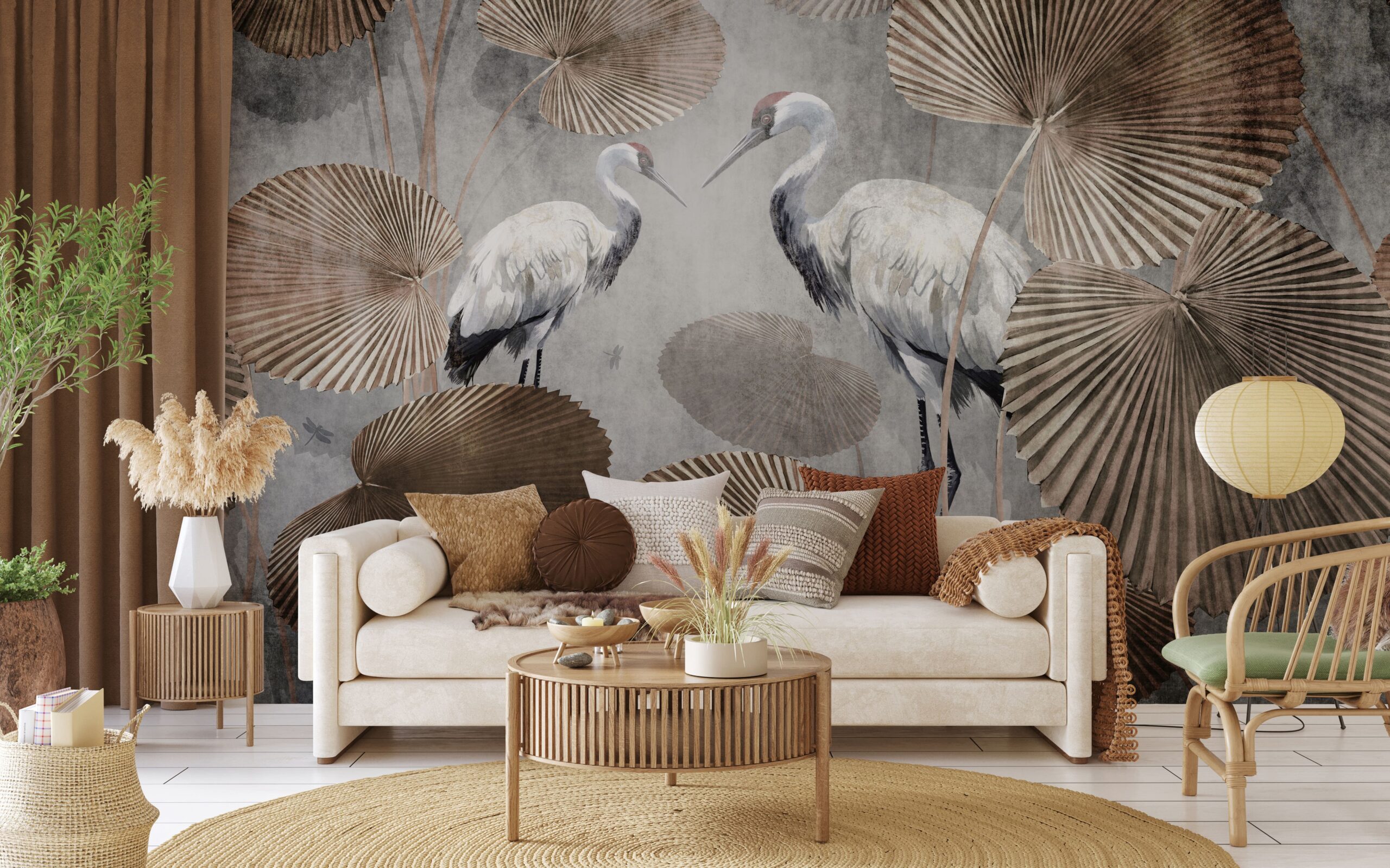 Fototapete „Harmonie der Kraniche“ – Orientalische Eleganz, natürliche Symbolik und zeitlose Ruhe für Ihr Interieur