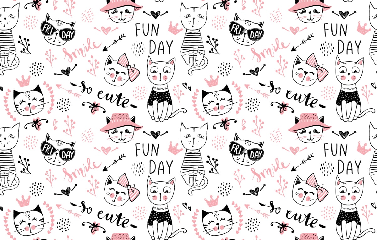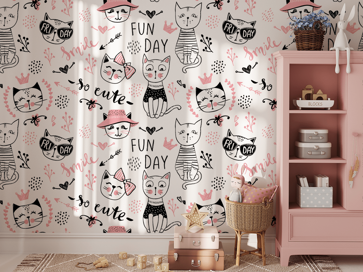 Verleihen Sie dem Kinderzimmer Ihres Kindes mit der Fototapete „Katzenwelt der Freude“ eine einzigartige Atmosphäre. Das fröhliche Muster mit lustigen, cartoonartigen Katzen in zarten Rosa- und Schwarztönen weckt Unbeschwertheit und positive Gefühle und schafft einen freundlichen und inspirierenden Raum. Freundliche Katzen, Schriftzüge und kleine Details sorgen für ein Lächeln und Kreativität im Raum.