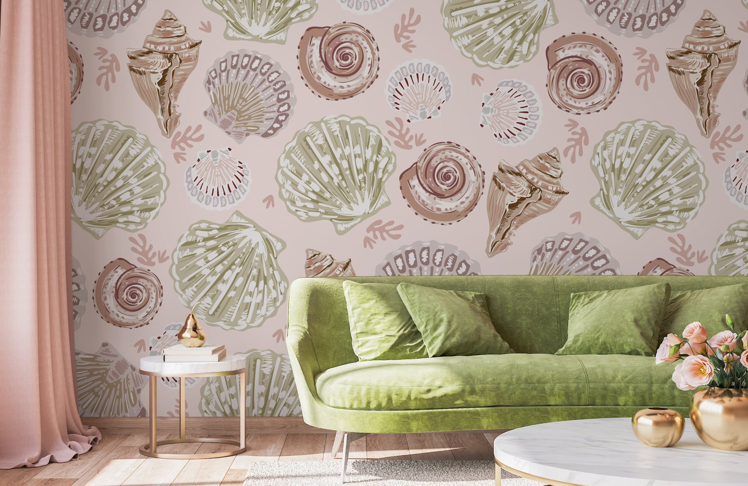 Verleihen Sie Ihrem Zuhause mit der Fototapete „Meeressüße“ eine Atmosphäre der Ruhe und Frische. Das zarte Pastellmuster mit Muschelmotiven und Meeresschätzen erinnert an Meeresbrisen und sanfte Wellen und verleiht dem Raum eine leichte und beruhigende Ästhetik. Dezente Farben und raffinierte Details fügen sich harmonisch in moderne wie auch klassische Einrichtungsstile ein.