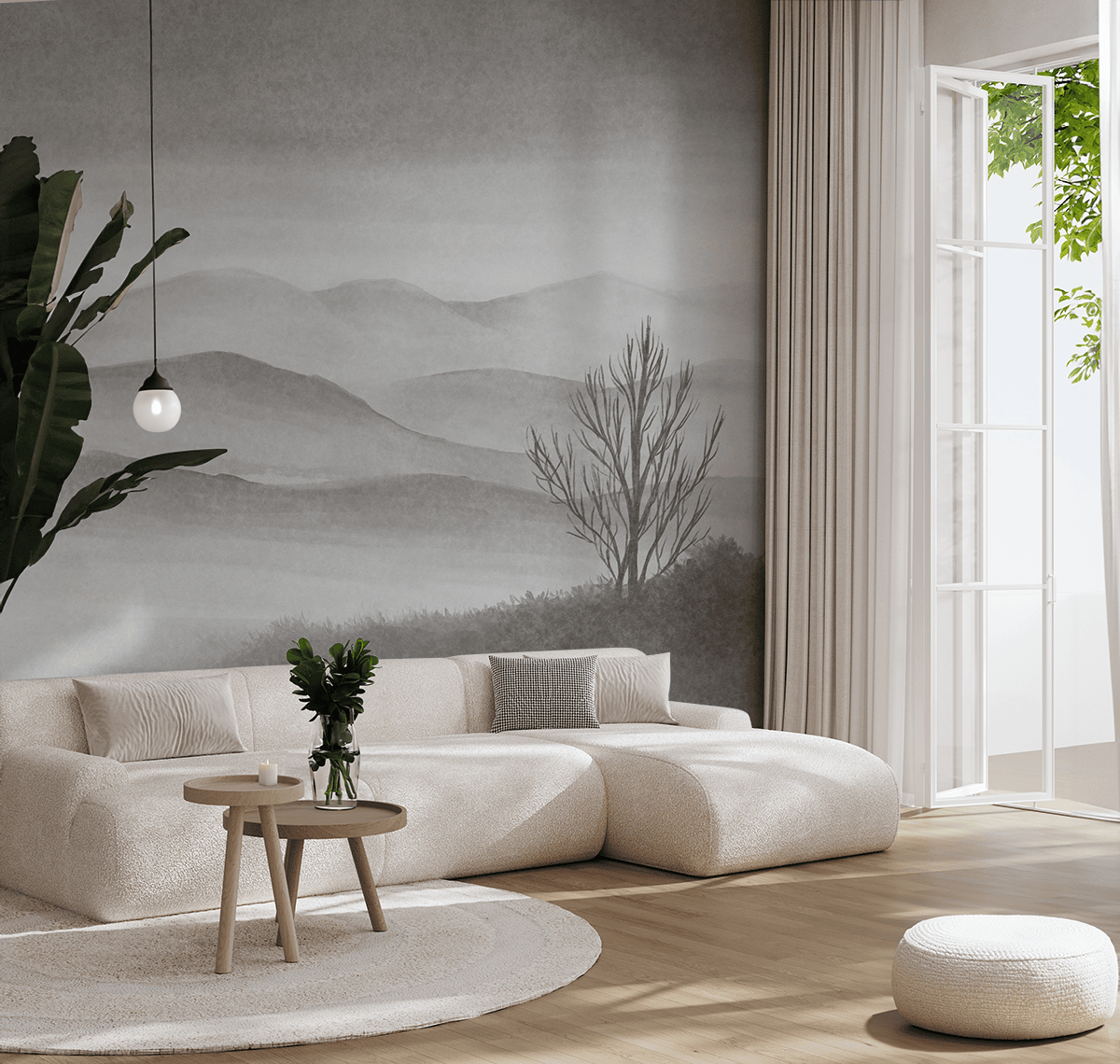 Verleihen Sie Ihrem Zuhause mit der Fototapete „Nebelige Ruhe“ eine außergewöhnliche Atmosphäre. Diese malerische Landschaft, die von Nebel umhüllte Berge und einen einsamen Baum zeigt, schafft eine Atmosphäre der Stille und Besinnung und passt perfekt zu einem minimalistischen und zurückhaltenden Einrichtungsstil. Die sorgfältig abgestimmten Grau- und Weißtöne verleihen Eleganz und schaffen einen subtilen, fast meditativen Raum, der Entspannung und Ruhe fördert.