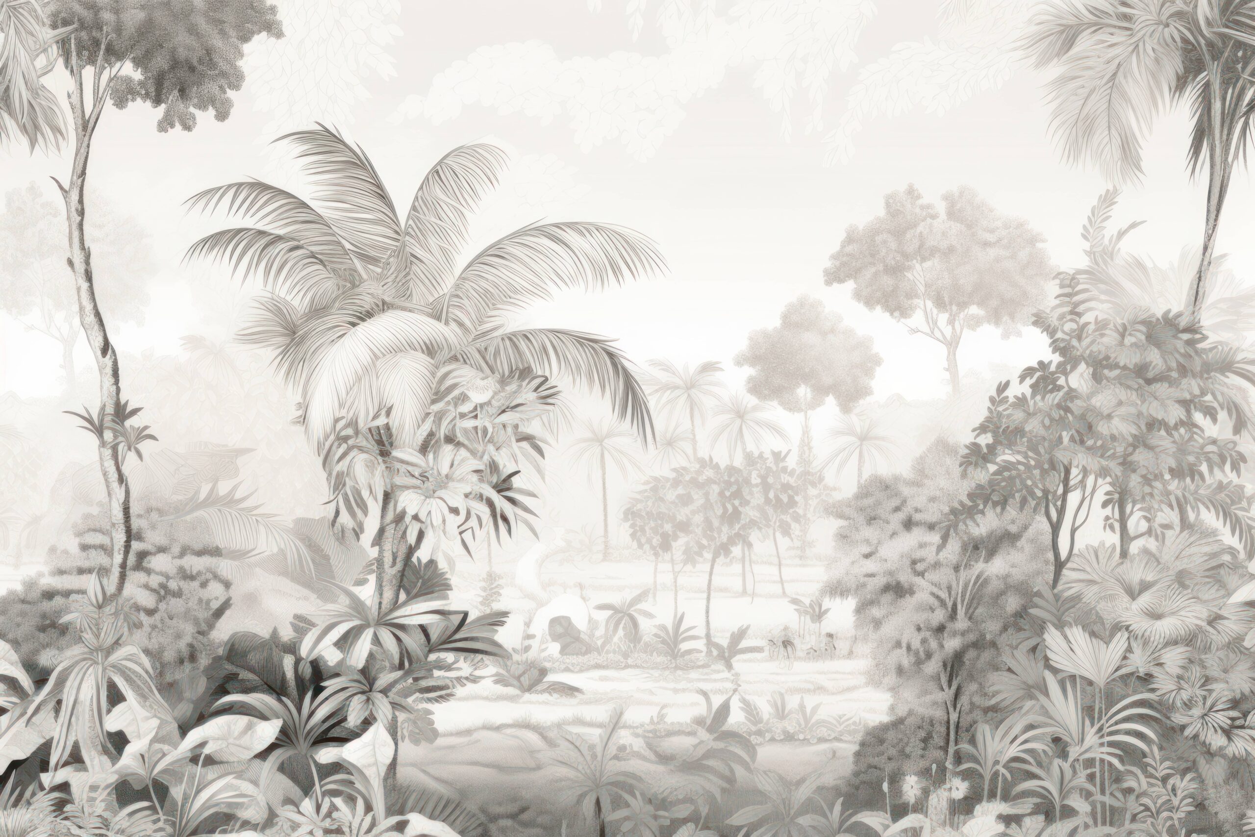 Verleihen Sie Ihrem Zuhause mit der Fototapete „Misty Tropic Paradise“ eine einzigartige Atmosphäre. Dieses zarte, monochrome Motiv des tropischen Dschungels hüllt den Raum in einen sanften Nebel und verströmt die Ruhe eines exotischen Regenwaldes. Die präzisen Details der Blätter und Bäume schaffen eine Atmosphäre von Geheimnis und natürlicher Harmonie, die sich perfekt in moderne wie auch klassische Einrichtungsstile einfügt.