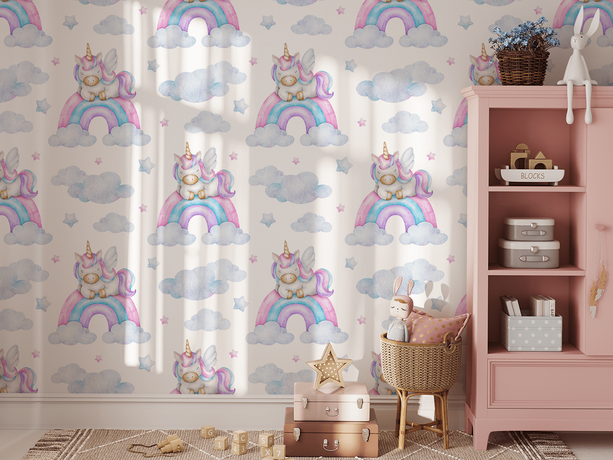 Entführen Sie Ihr Kind mit der Fototapete „Regenbogenstopp“ in eine Welt voller Farben und Fantasie. Bezaubernde Einhörner, die auf sanften Regenbögen ruhen, umgeben von flauschigen Wolken und funkelnden Sternen, schaffen eine einzigartige, freundliche Atmosphäre im Zimmer, die die Fantasie anregt und viel positive Energie spendet.