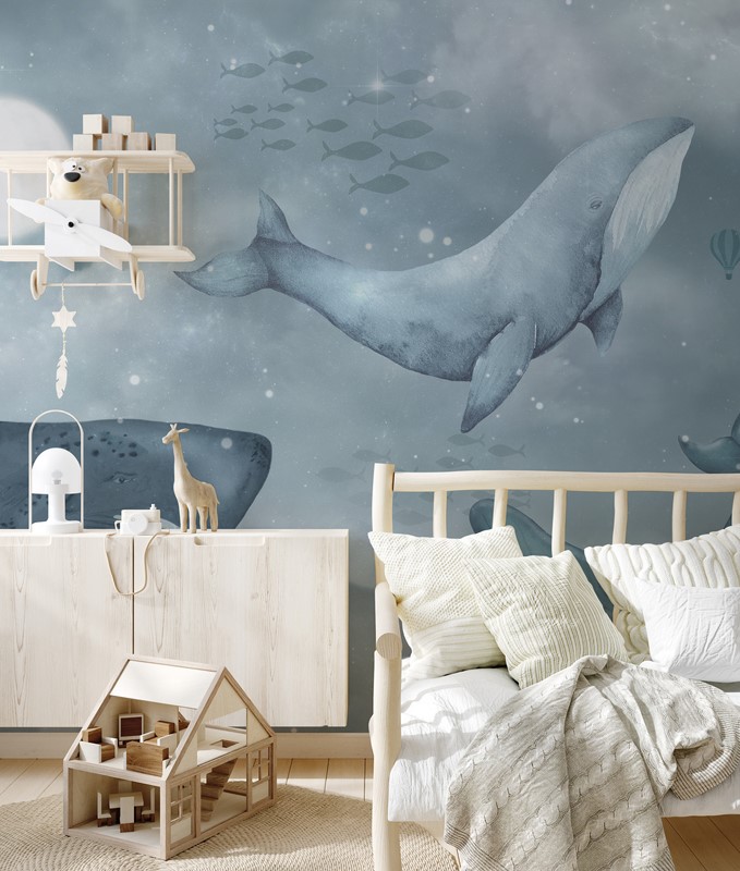Die Fototapete „Waltanz“ schafft eine freundliche, inspirierende Atmosphäre im Kinderzimmer und regt zum Träumen und kreativen Spielen an. Dank ihres universellen Designs passt sie sowohl in Jungen- als auch in Mädchenzimmer, und eine Wand mit Walmotiv kann die Raumgestaltung komplett verändern.