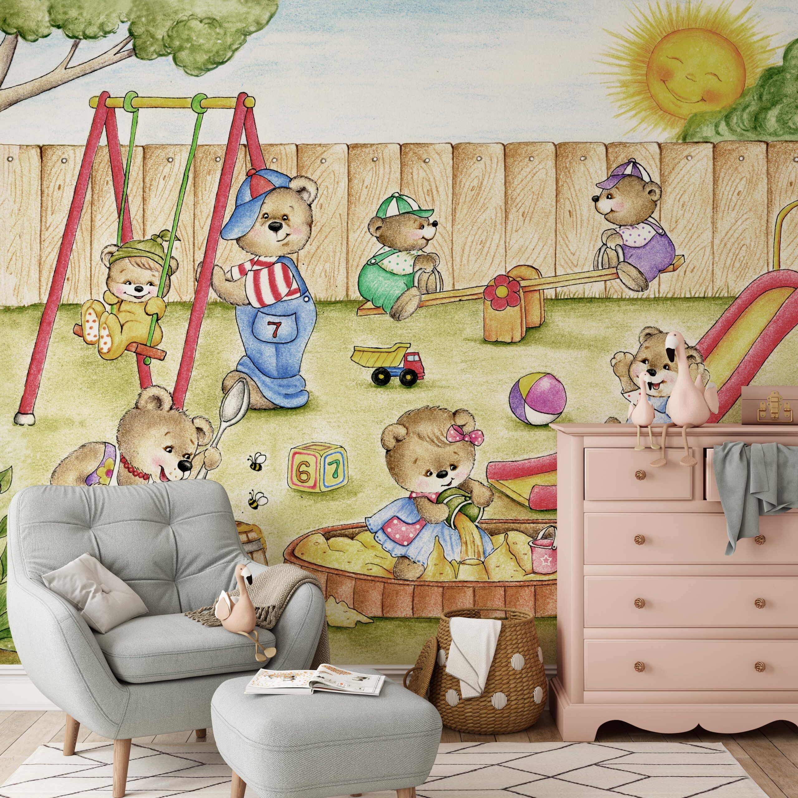 Bringen Sie mit der Wandtapete „Teddybärenspielplatz“ ein Lächeln und Freude ins Kinderzimmer. Dieses warme und charmante Bild zeigt eine Gruppe niedlicher Teddybären, die auf einer Schaukel, einer Rutsche und im Sandkasten spielen und so einen Ort voller Spaß und Freundschaft schaffen. Leuchtende Farben und liebevolle Details beleben jedes Kinderzimmer und fördern unbeschwerte Momente und kreatives Spielen.
