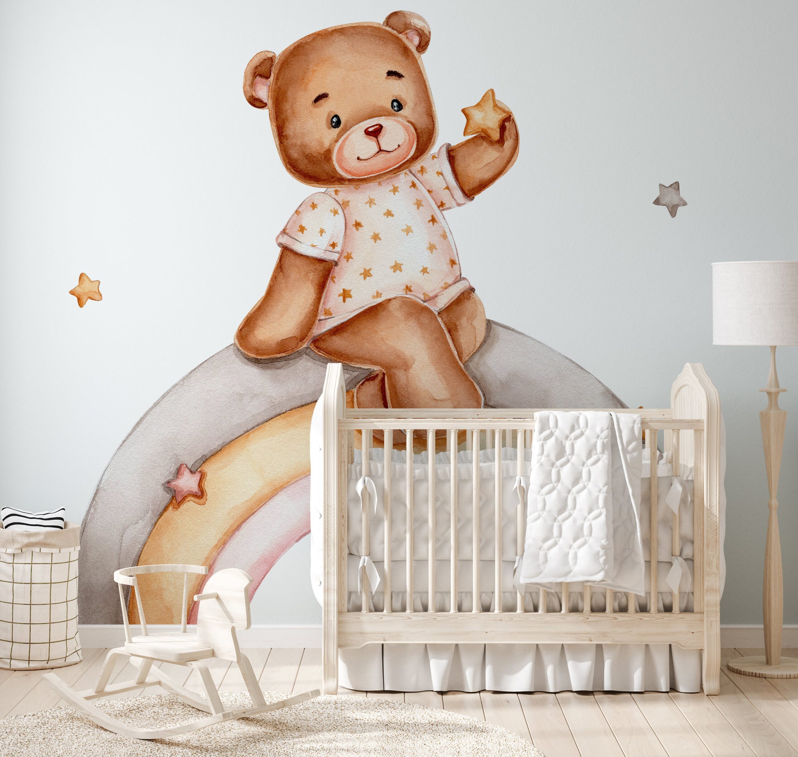 Verleihen Sie Ihrem Zuhause mit der Fototapete „Regenbogen-Teddybärwelt“ einen Hauch von Magie und Freude. Dieses bezaubernde, farbenfrohe Muster zeigt einen Teddybären auf seiner Reise über einen verzauberten Regenbogen und erfüllt den Raum mit Wärme und Optimismus. Bunte Wolken, Sterne und Regenbögen schaffen eine märchenhafte Atmosphäre, perfekt für ein Kinderzimmer.