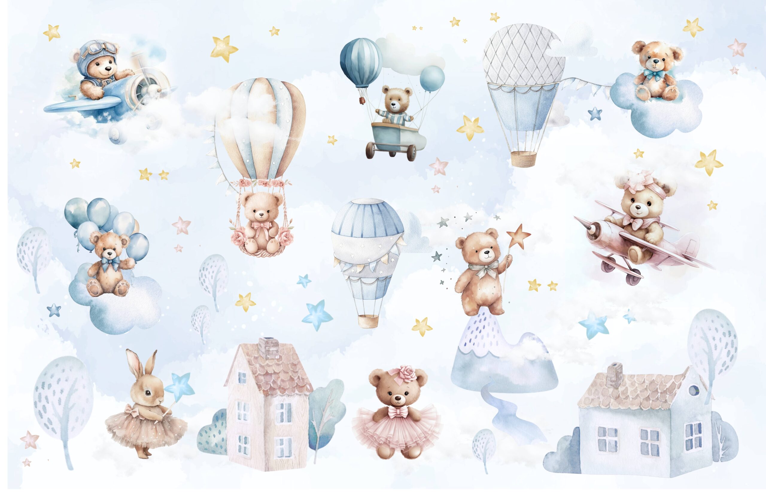 Verleihen Sie dem Kinderzimmer Ihres Kindes mit der Wandtapete „Teddybärs Sternenland“ eine einzigartige Atmosphäre. Dieses zarte Pastellmuster zeigt liebenswerte Teddybären, die auf Ballons, Wolken und Flugzeugen schweben, umgeben von Sternen – eine Welt voller Wärme und Fantasie. Dezente Farben und sanfte Details passen perfekt ins Zimmer von Babys und älteren Kindern, fördern die Fantasie und bieten einen gemütlichen Raum zum Spielen und Entspannen.