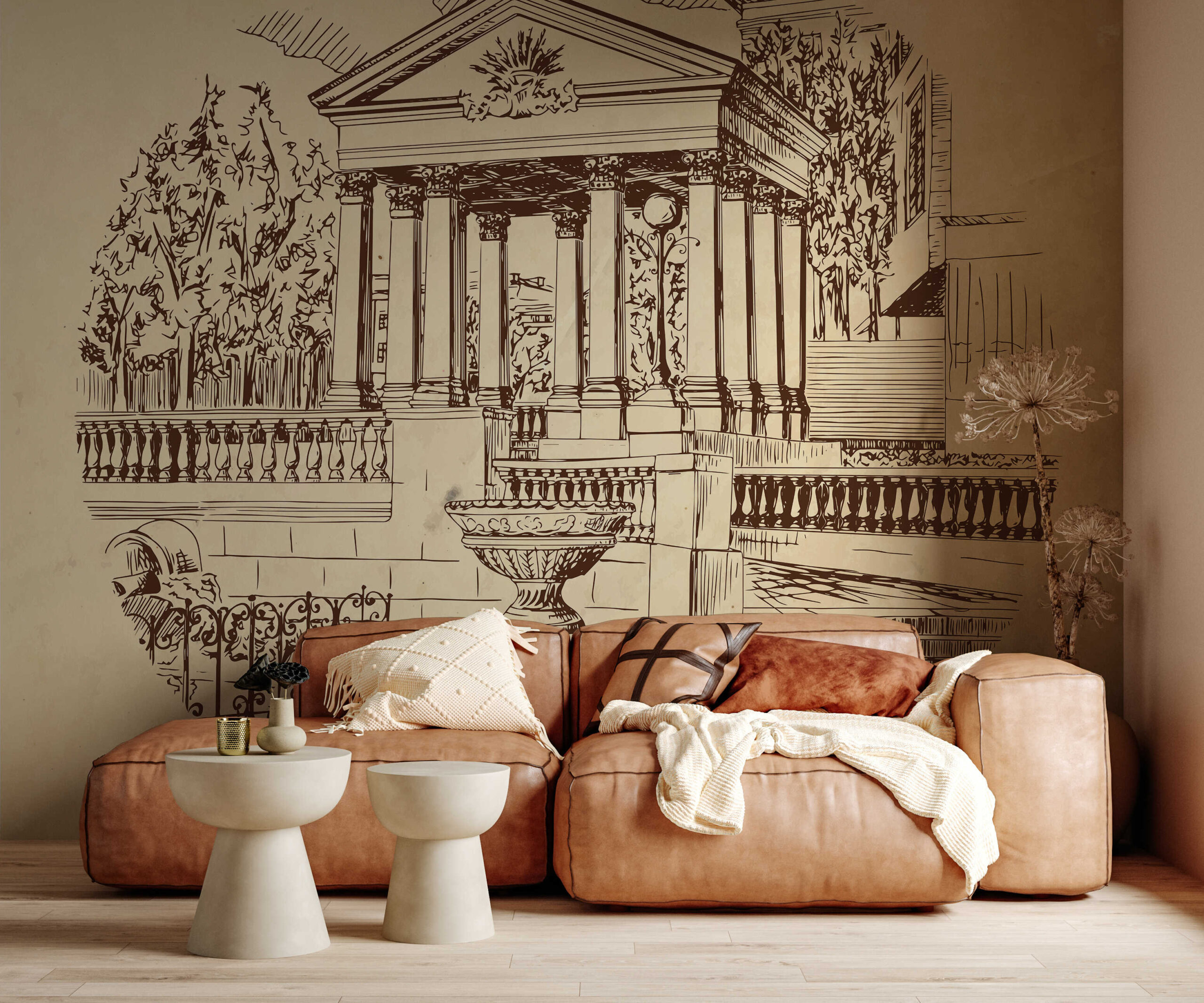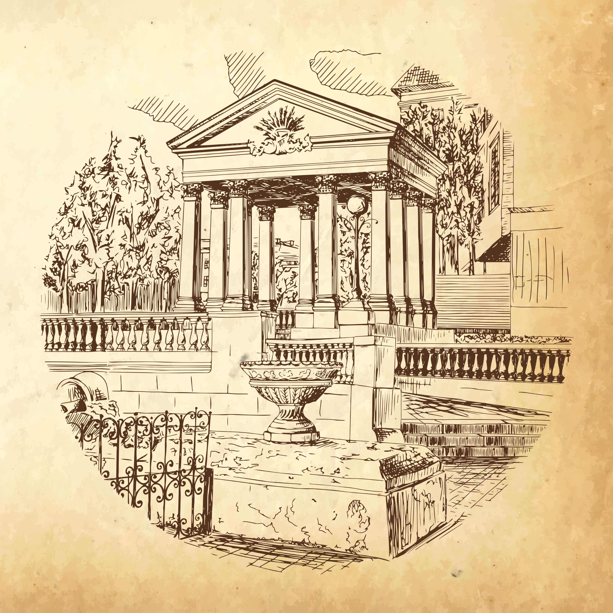 Entdecken Sie den Zauber vergangener Zeiten mit der Fototapete „Tempel der Stille“. Diese kunstvolle Darstellung eines klassischen Gebäudes mit Säulen, einem Steinbrunnen und subtilen architektonischen Details entführt Sie in eine Welt vergangener Eleganz und Ruhe. Zarte Linien, dezente Farben und eine ausgewogene Komposition machen diese Fototapete zu einer einzigartigen Dekoration für jedes Interieur.