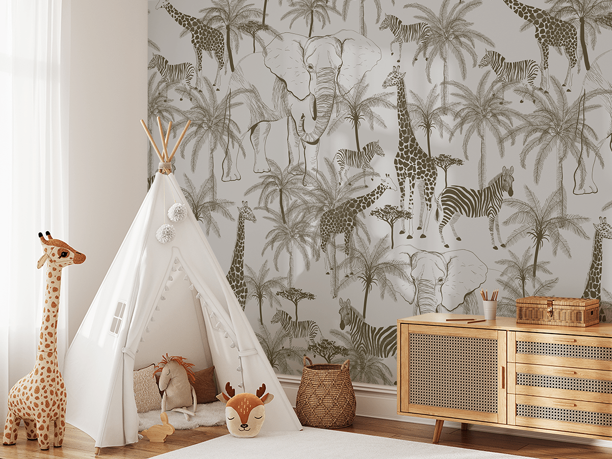 Eine Fototapete ist mehr als nur Dekoration – sie schafft einen Raum voller Spaß, Fantasie und Wärme, der Ihr Kind dazu inspiriert, in Gesellschaft exotischer Freunde fantastische Abenteuer zu erleben.