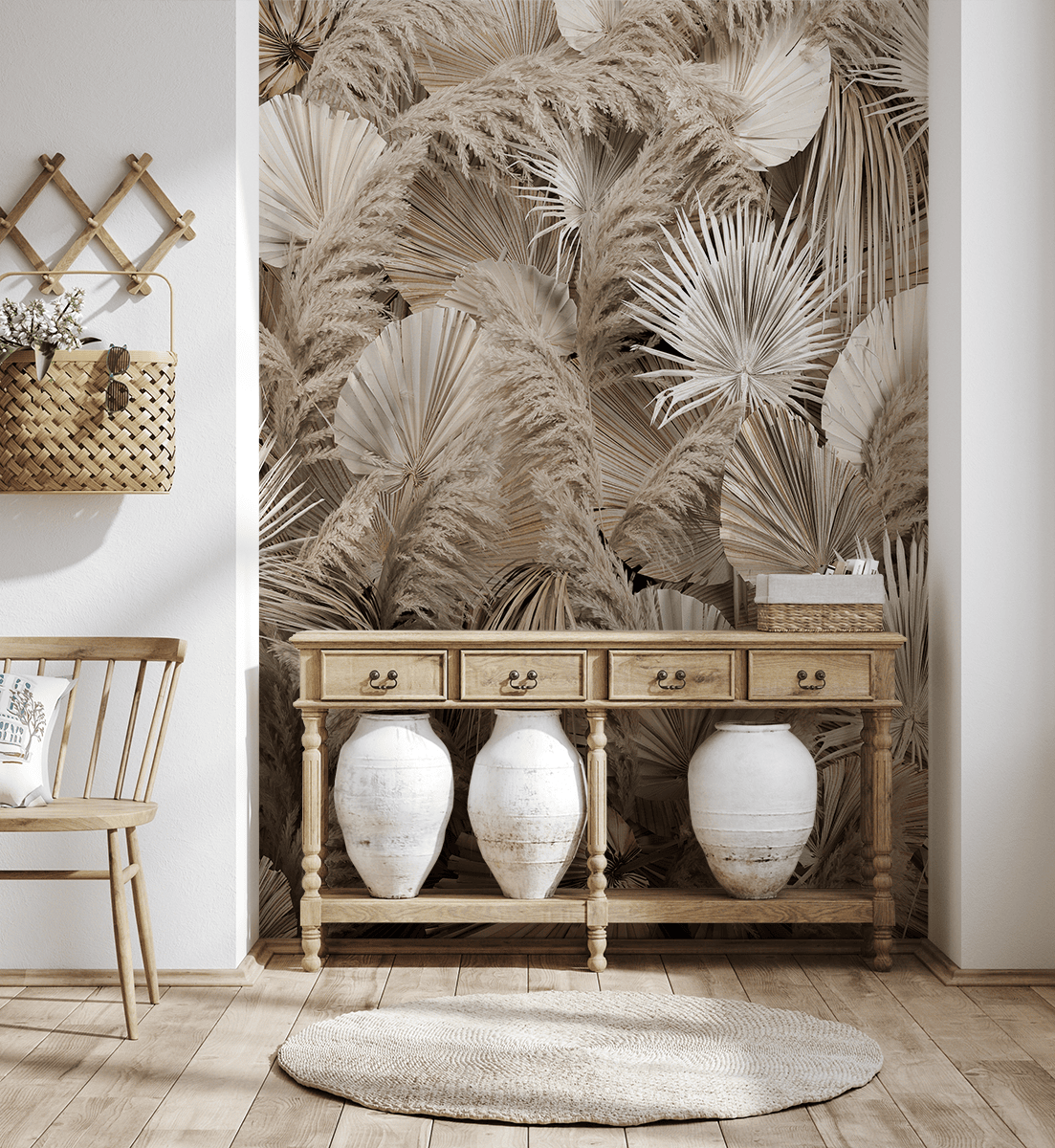 Bringen Sie mit der Fototapete „Trockene Eleganz“ die Ruhe, Wärme und Leichtigkeit der Natur in Ihr Zuhause. Dieses zarte Muster, inspiriert von getrockneten Palmblättern und Pampasgras, besticht durch seine organische Ästhetik und die dezente, beige Farbpalette. Die Komposition begeistert mit ihrer subtilen Textur und harmonischen Formen und schafft eine Atmosphäre der Ruhe und natürlichen Schönheit.