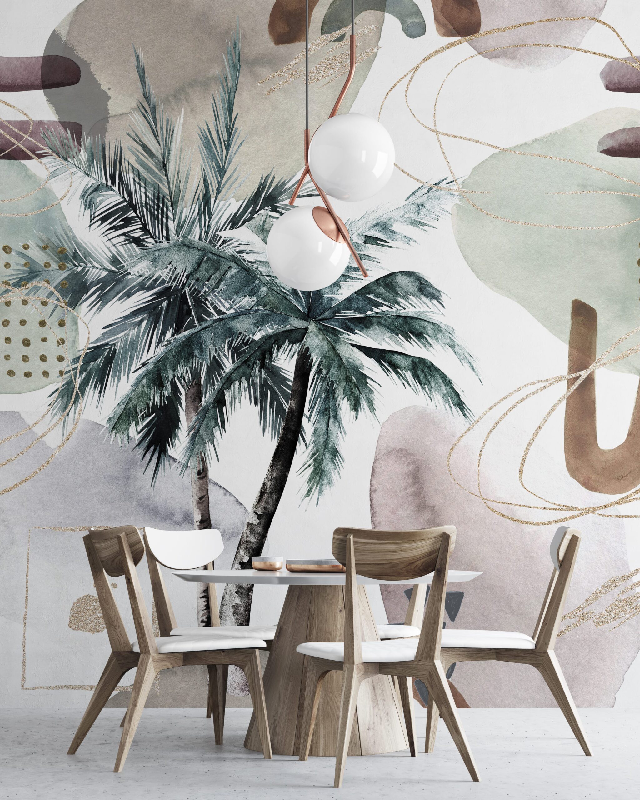 Verleihen Sie Ihrem Interieur mit der Fototapete „Tropical Rhythm“ einen Hauch tropischer Leichtigkeit. Die Komposition aus Palmenblättern, abstrakten Formen und einer dezenten Farbpalette schafft eine einzigartige Verbindung von Natur und zeitgenössischer Kunst. Zarte Aquarell-Farbverläufe und goldene Details verleihen dem Ganzen einen raffinierten und zugleich ungezwungenen Charakter.