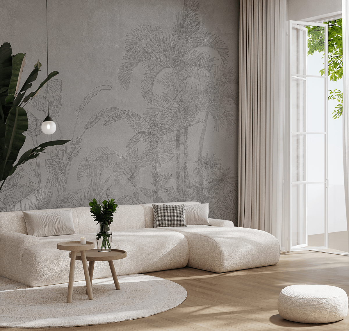 Die zurückhaltende graue Farbpalette und die präzise wiedergegebenen Pflanzendetails verleihen dem Raum eine Leichtigkeit, ohne ihn zu dominieren, sondern ergänzen harmonisch jede Einrichtung – ob modern oder klassisch.
