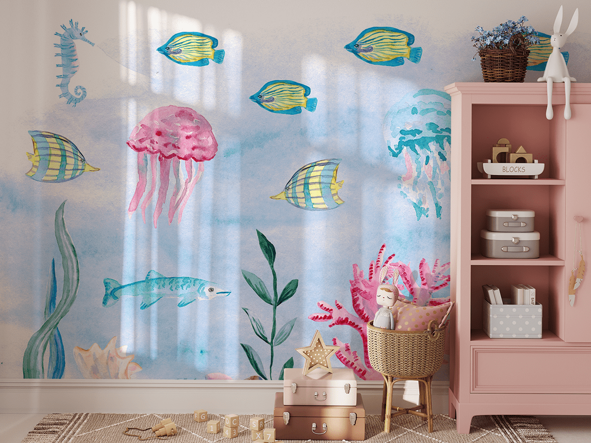 „Unterwassersymphonie“ Fototapete – Ein farbenfrohes Abenteuer, Meeresfantasie und eine Märchenwelt fürs Kinderzimmer