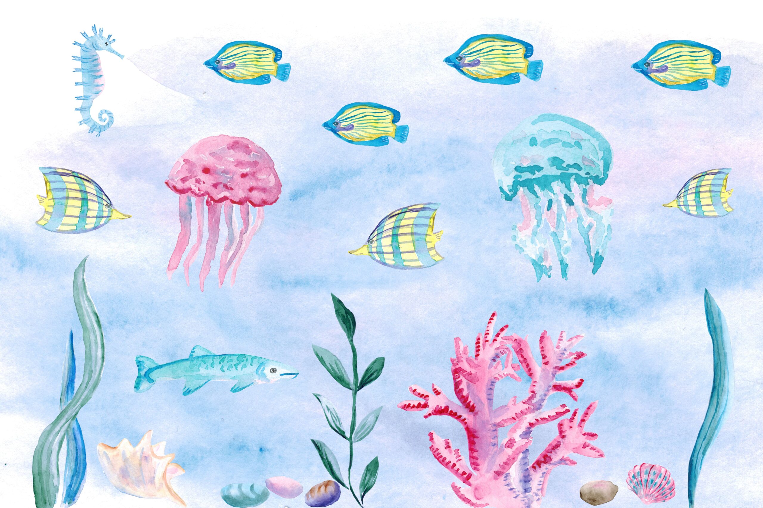 Tauchen Sie ein in die magische Welt des Ozeans mit der Fototapete „Unterwassersymphonie“! Diese farbenfrohe, handgemalte Illustration entführt die Kleinsten in ein Unterwasserland voller fröhlicher Fische, Quallen, Seepferdchen und Korallen. Zarte Aquarelltöne und bezaubernde Meeresbewohner regen die Fantasie an und bringen eine Atmosphäre unbeschwerter Meeresabenteuer ins Kinderzimmer.