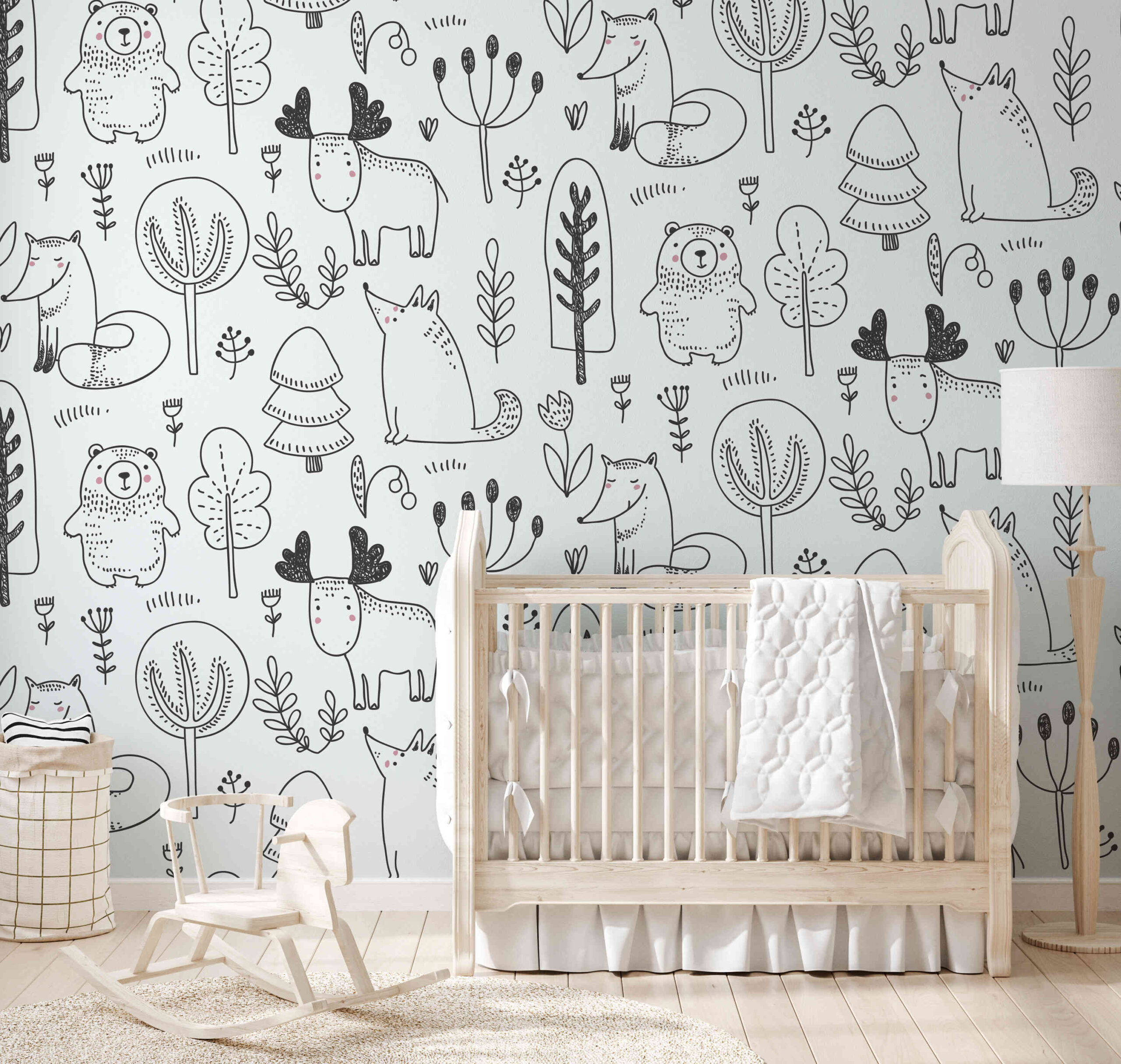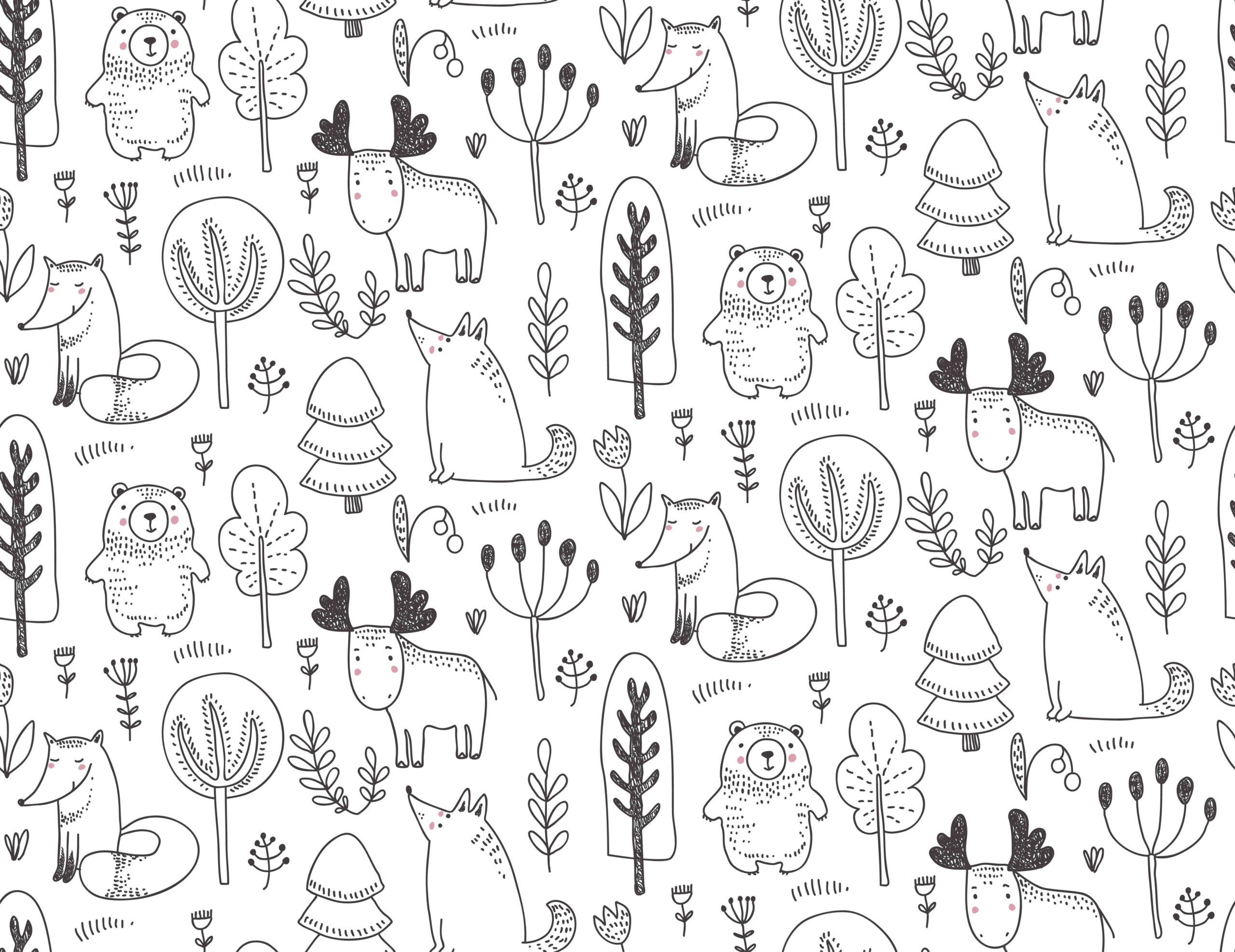 Holen Sie sich mit der Fototapete „Waldkuscheltiere“ niedliche Teddybären, Füchse und Elche in Ihr Zimmer. Dieses fröhliche, handgezeichnete Muster in Schwarz-Weiß mit zarten rosa Akzenten entführt Sie in eine Waldwelt voller Wärme und Freundschaft. Die einfachen und liebenswerten Figuren machen Ihr Zimmer gemütlich und voller kindlicher Freude.