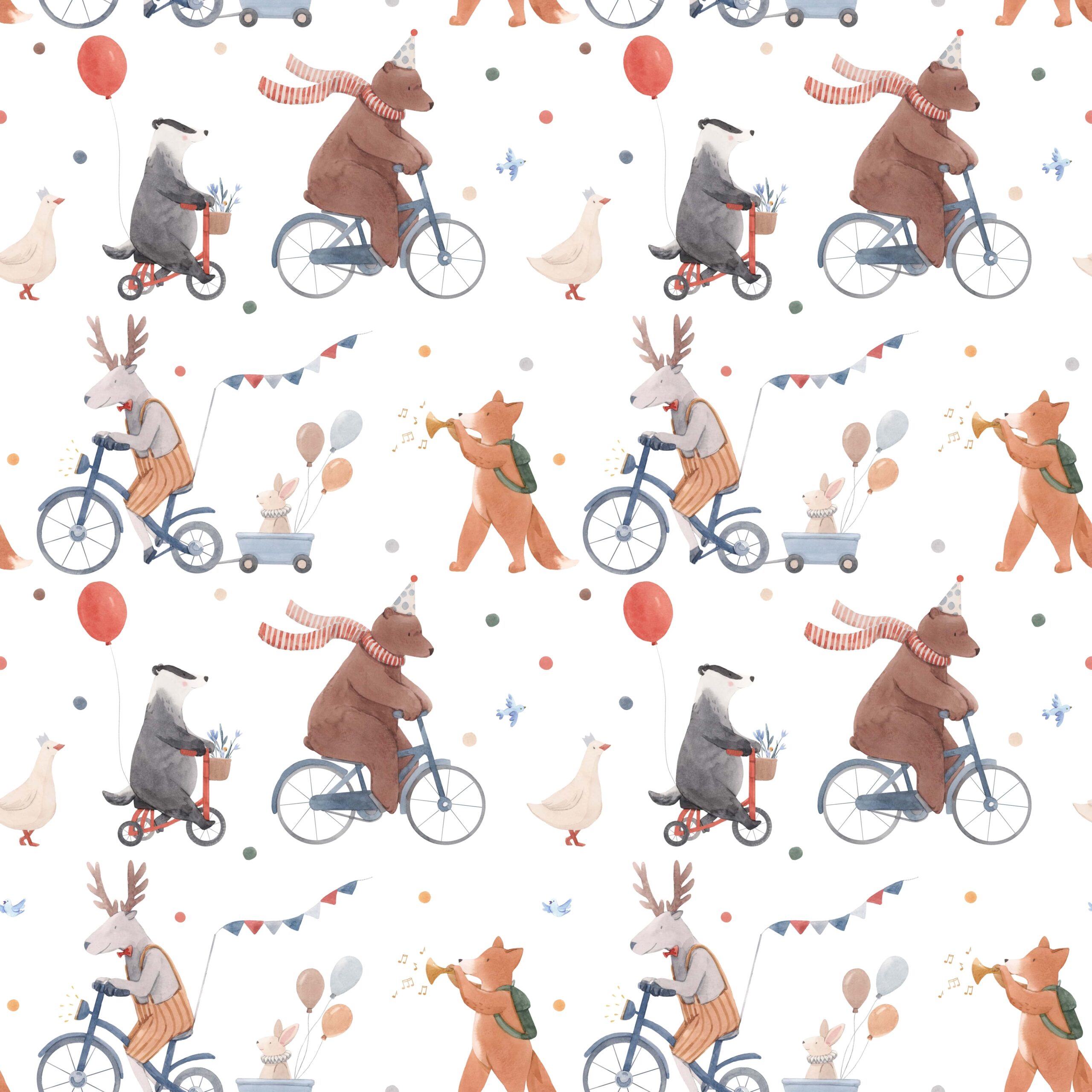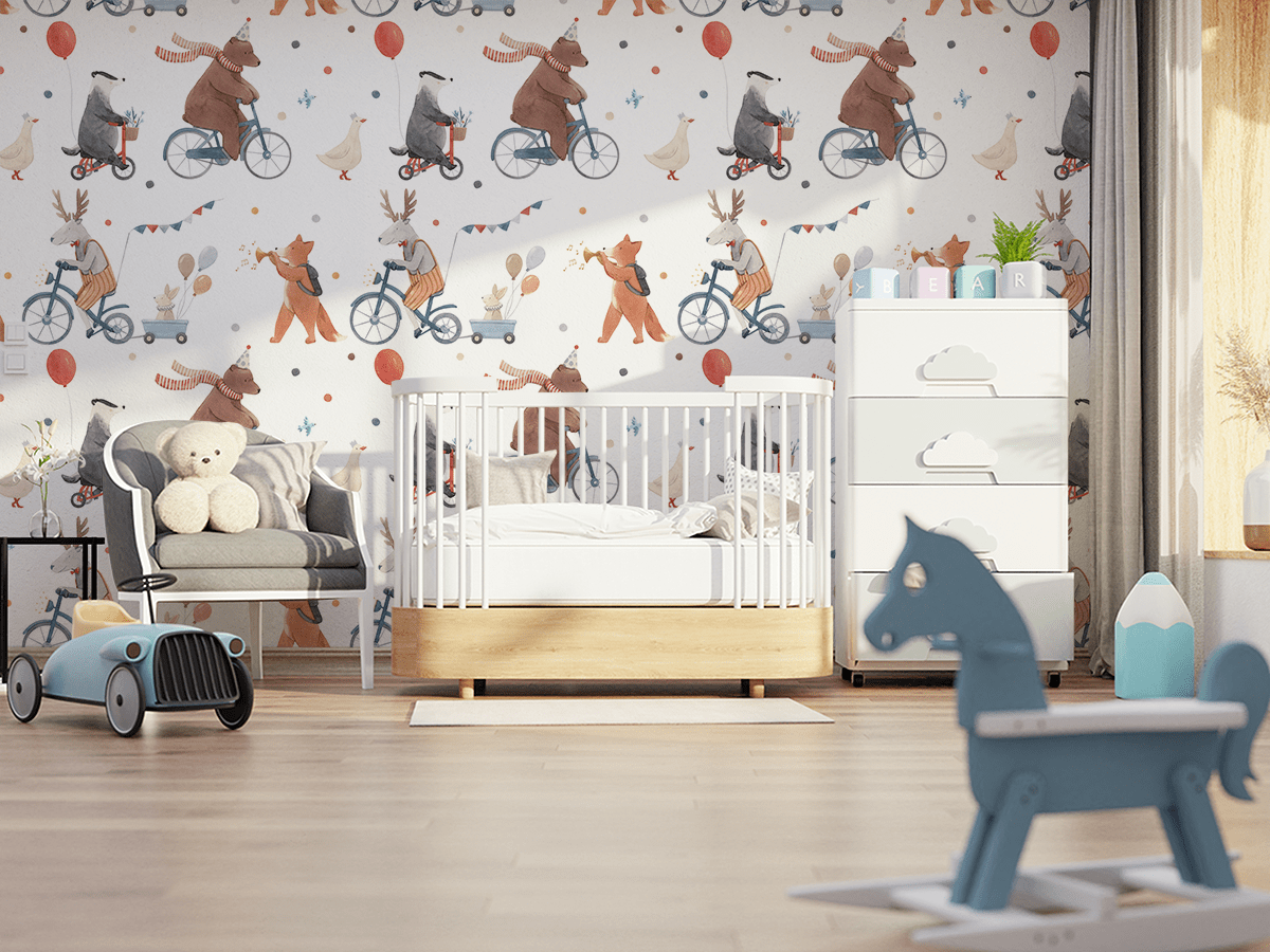 Verwandeln Sie das Zimmer Ihres Kindes mit der Fototapete „Waldparade“ in einen magischen Ort. Dieses bezaubernde Muster zeigt fröhliche Waldtiere – einen Teddybären, einen Fuchs, ein Reh, einen Dachs und ein Kaninchen –, die gemeinsam auf Fahrrädern und Rollern Spaß haben und zur Musik tanzen. Zarte Aquarellfarben und freundliche Figuren bringen Wärme, Freude und eine Atmosphäre unbeschwerter Abenteuer in den Raum.