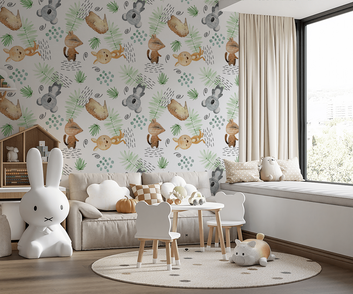 Beleben Sie Ihr Zuhause mit der Wandtapete „Waldtiere aus den Antipoden“ – voller Wärme, Spaß und märchenhaftem Charme. Dieses einzigartige Muster mit handgemalten Tieren aus australischen Wäldern – einem Koala, einem Känguru, einem Ameisenigel und einem Nasenbeutler – entführt Sie in die Welt der kindlichen Fantasie und in eine Natur voller Harmonie. Eine Pastellfarbenpalette, Aquarellblätter und dezente Details schaffen eine ruhige und zugleich fröhliche Atmosphäre.