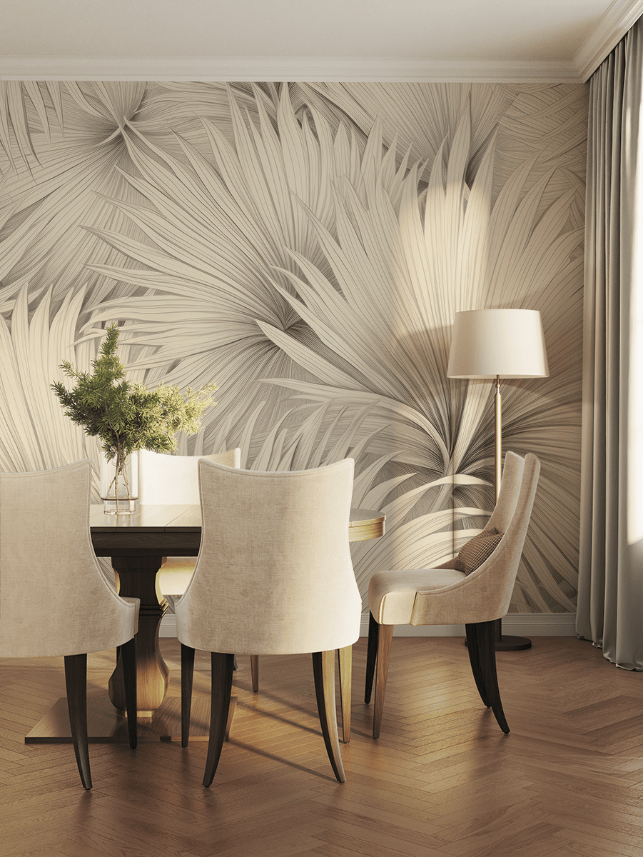 Entdecken Sie die subtile Schönheit der Natur mit der Fototapete „Wüstenwind“. Dieses ätherische, organisch inspirierte Muster erinnert an die sanfte Bewegung trockener Blätter im Wüstenwind. Die helle, zurückhaltende Farbpalette und die feinen Linien verleihen Ihrem Interieur ein Gefühl von Weite, Leichtigkeit und Ruhe.
