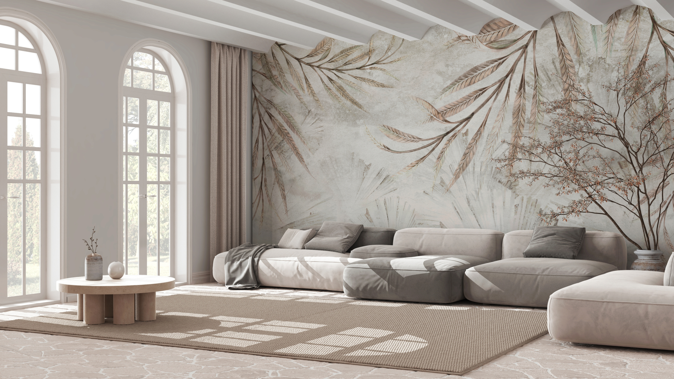 Dies ist die perfekte Wahl für alle, die helle, natürliche Dekorationen und eine ruhige Ästhetik schätzen. Die Tapete bildet einen dezenten Hintergrund, der den Raum aufhellt und ihm eine leichte, frische Atmosphäre sowie einen zeitlosen, von der Natur inspirierten Charme verleiht.