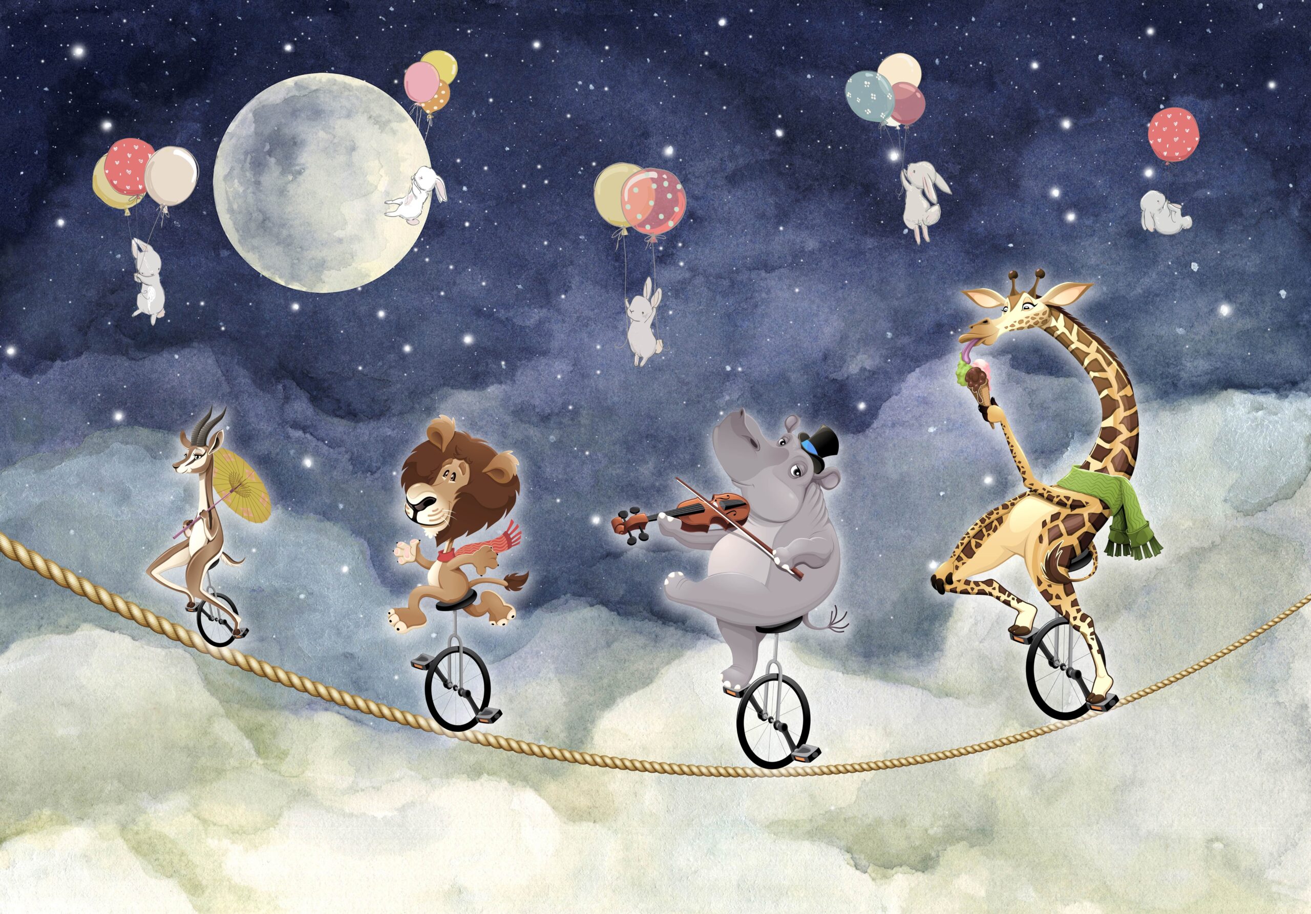 Tauchen Sie ein in die magische Welt der Träume mit der Wandtapete „Zirkusnacht über den Wolken“. Dieses charmante, farbenfrohe Motiv zeigt eine fröhliche Parade von Zirkustieren, die auf einem Seil über den Wolken balancieren – zwischen Sternen, Ballons und einem leuchtenden Mond. Springende Hasen, eine Giraffe, die Eis isst, oder ein Nilpferd, das Geige spielt – jedes Detail lädt zum Spielen ein und fördert die Fantasie Ihres Kindes.