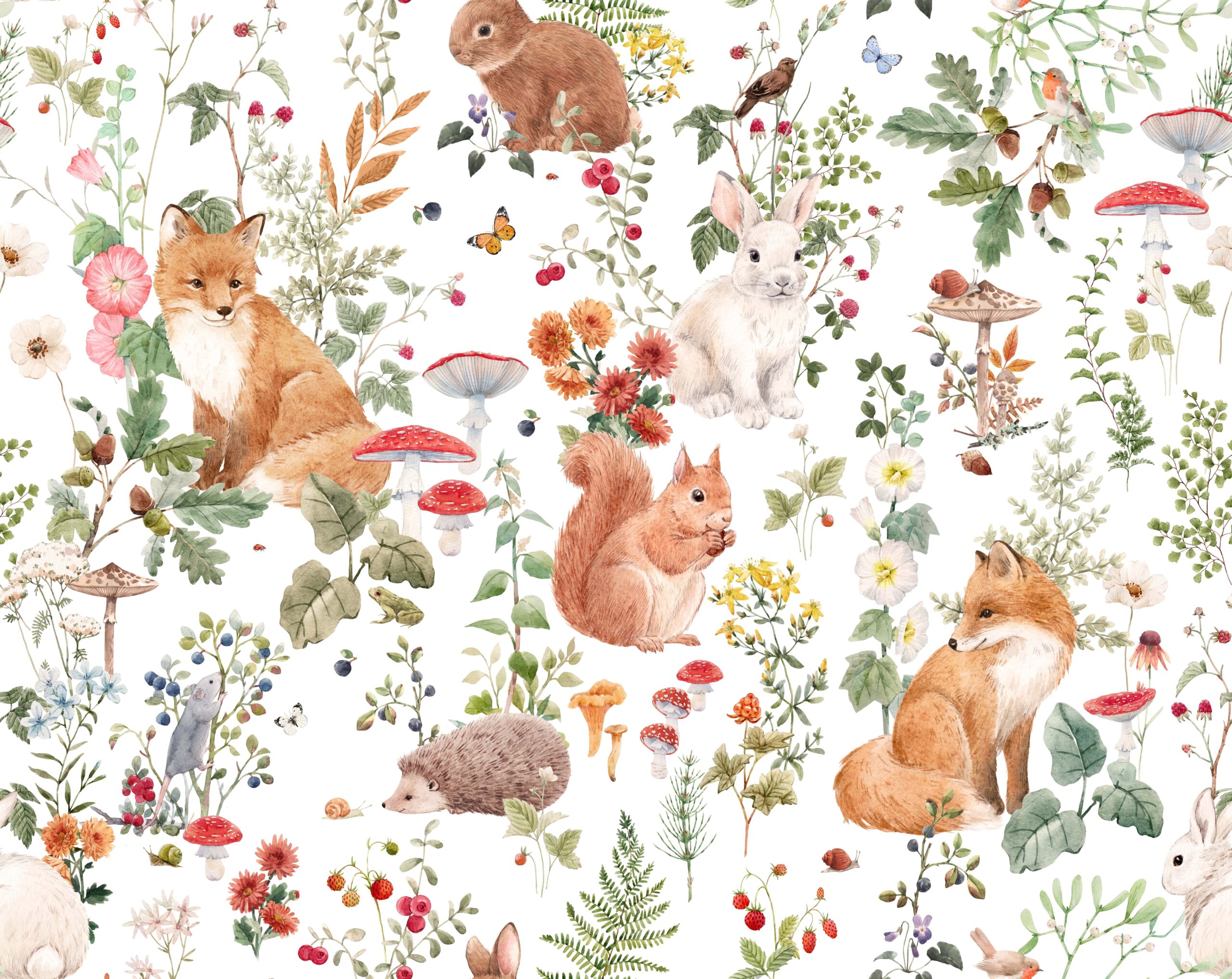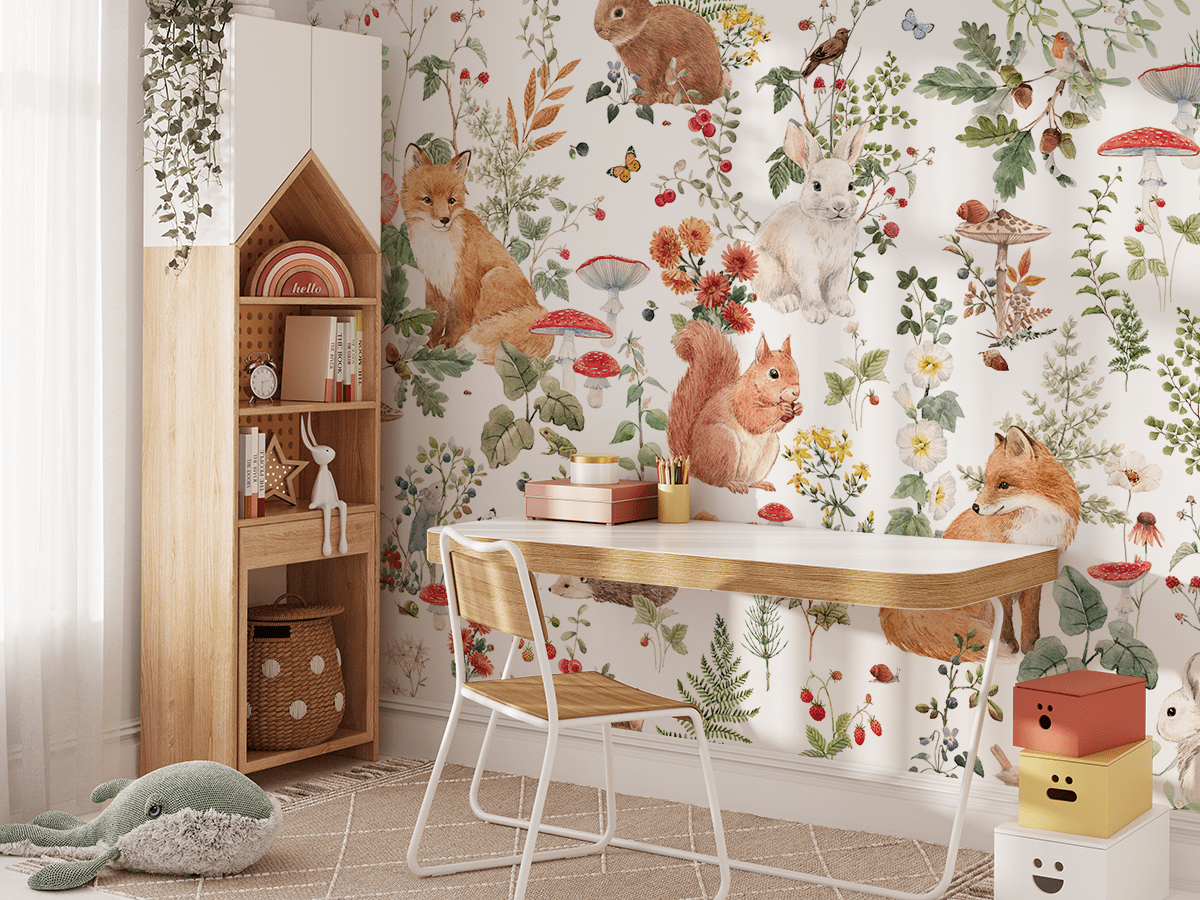 Verwandeln Sie das Kinderzimmer Ihres Kindes mit der Fototapete „Zwischen Pilzen und Blumen“ in ein verwunschenes Land. Dieses bezaubernde Muster ist voller fröhlicher Tiere, bunter Blumen und Waldpilze, die die Fantasie der Kinder anregen und sie dazu ermutigen, die Natur zu entdecken.