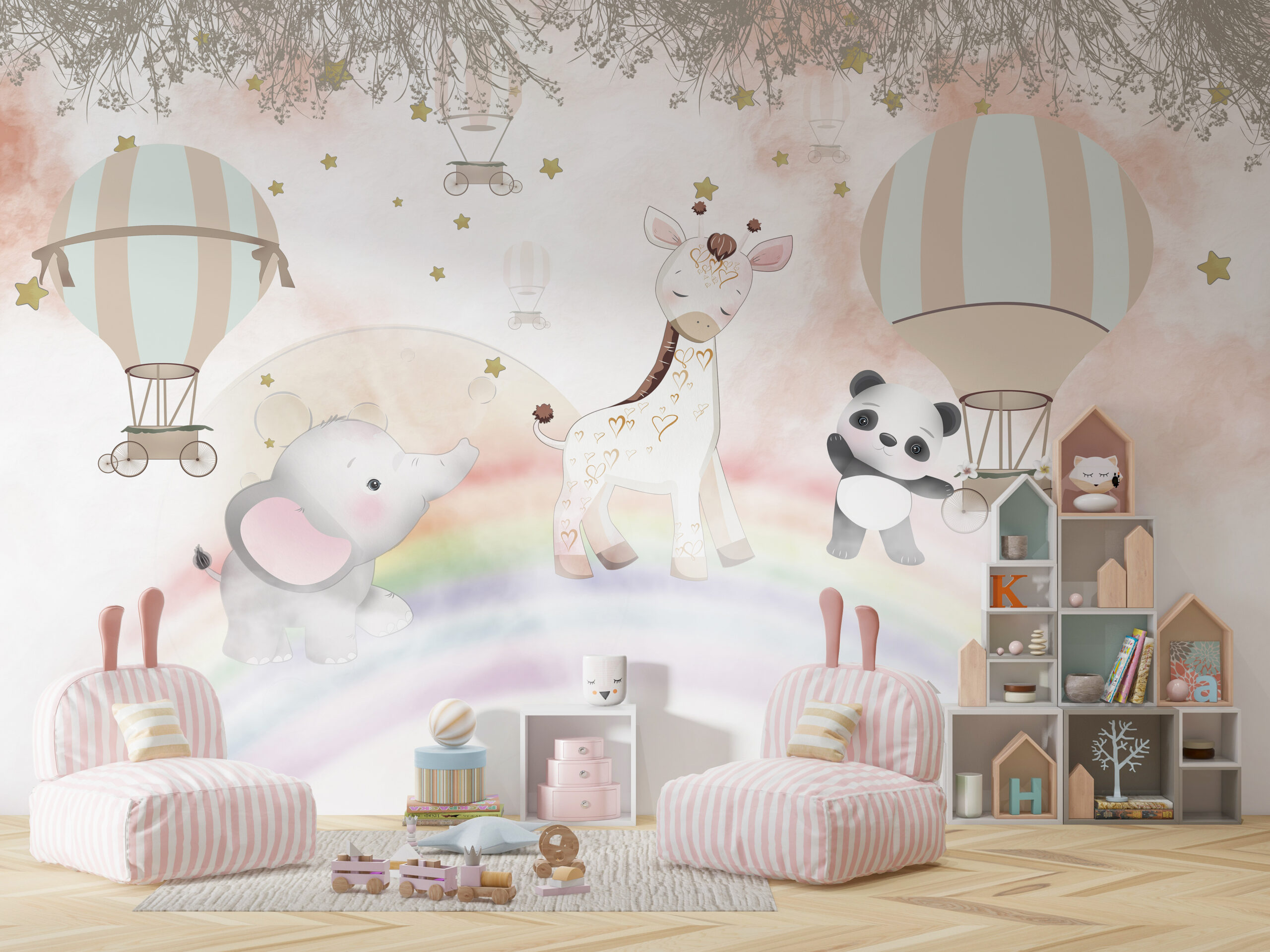 Lassen Sie sich mit dieser fantastischen Fototapete „Tiere auf dem Regenbogen“ in eine magische Welt voller Farben und Charme entführen. Ideal für ein Kinderzimmer, ein Kinderzimmer oder einen Spielbereich. Es wird eine einzigartige Atmosphäre schaffen und Kleinkinder und Erwachsene gleichermaßen begeistern.